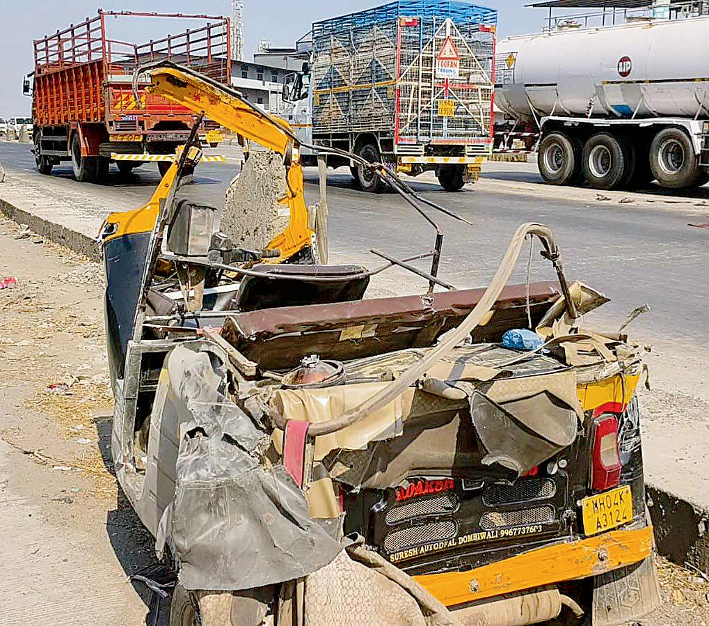 મુંબઈ-નાશિક હાઇવે પર સોમવારે એક વાહને ઑટોરિક્ષાને ટક્કર મારતાં બે જણે જીવ ગુમાવ્યા હતા. પોલીસ-અધિકારીએ આપેલી માહિતી મુજબ ભિવંડીના બે યુવકો એક ઑટોરિક્ષામાં જઈ રહ્યા હતા ત્યારે પાછળથી એક વાહને રિક્ષાને જોરદાર ટક્કર મારી હતી. એ ટક્કરમાં બન્ને રસ્તા પર પડી ગયા હતા અને તેમને ગંભીર ઈજા થઈ હતી. રાહદારીઓ અને વાહનચાલકો બન્નેને હૉસ્પિટલ લઈ ગયા હતા જ્યાં ડૉક્ટરોએ તેમને મૃત્યુ પામેલા જાહેર કર્યા હતા. આ બાબતે કેસ નોંધીને હાઇવે પરથી CCTV ફુટેજની તપાસ કરવામાં આવી રહી છે એમ પોલીસ-અધિકારીએ જણાવ્યું હતું.