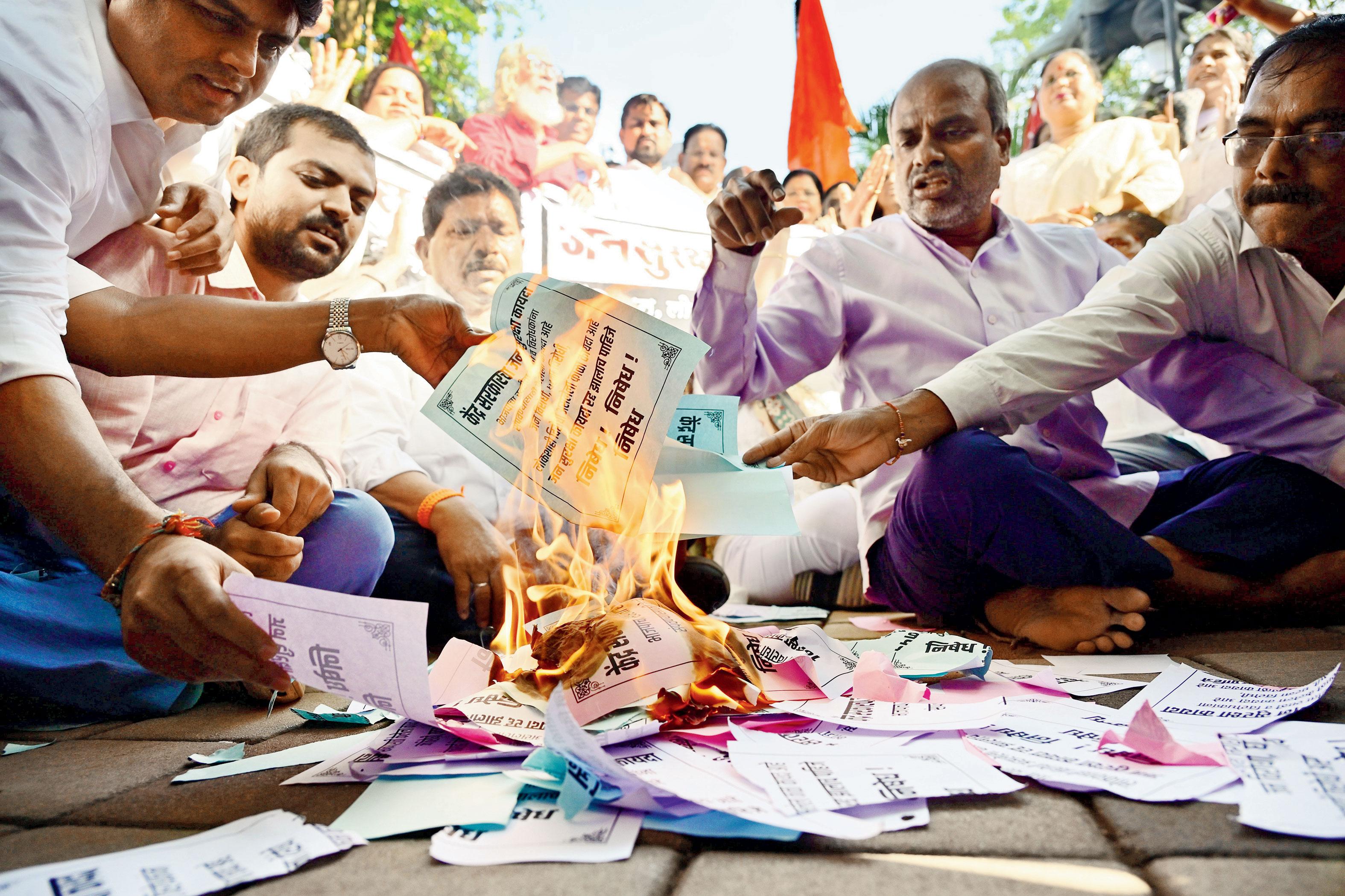 મહારાષ્ટ્ર સરકારે લાગુ કરેલા જન સુરક્ષા કાયદાનો વિરોધ કરવા ગઈ કાલે વિરોધી પક્ષો દાદરમાં શિવાજી પાર્ક પાસે ભેગા થયા હતા. તસવીર : શાદાબ ખાન