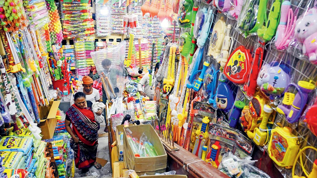 મસ્જિદ બંદરની એક દુકાનમાં ધુળેટીનો રંગીન ધમધમાટ જોવા મળ્યો હતો.