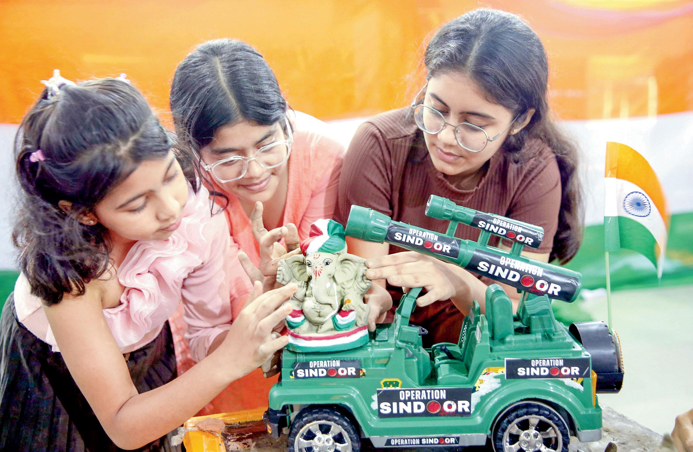 ગણેશ ચતુર્થીનો ઉત્સાહ સમગ્ર દેશમાં જોવા મળી રહ્યો છે. ભોપાલમાં સિદ્ધિ પંચાયત કમિટીએ ઑપરેશન સિંદૂર વિશે એક વર્કશૉપનું આયોજન કર્યું હતું. આ વર્કશૉપમાં છોકરીઓએ ઑપરેશન સિંદૂરના પ્રતીક સમાન સૈન્યના વાહન પર ગણપતિબાપ્પાની ઇકો-ફ્રેન્ડ્લી મૂર્તિ બનાવી હતી.