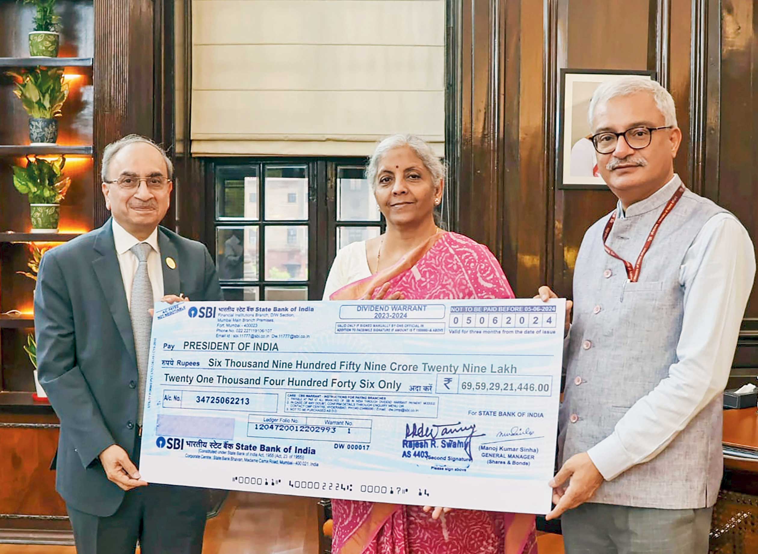 વર્ષ ૨૦૨૩-’૨૪ના વર્ષ માટેના ડિવિડન્ડનો ચેક ગઈ કાલે દિલ્હીમાં નાણાપ્રધાન નિર્મલા સીતારમણને આપતા સ્ટેટ બૅન્ક ઑફ ઇન્ડિયાના ચૅરપર્સન દિનેશ કુમાર ખારા.