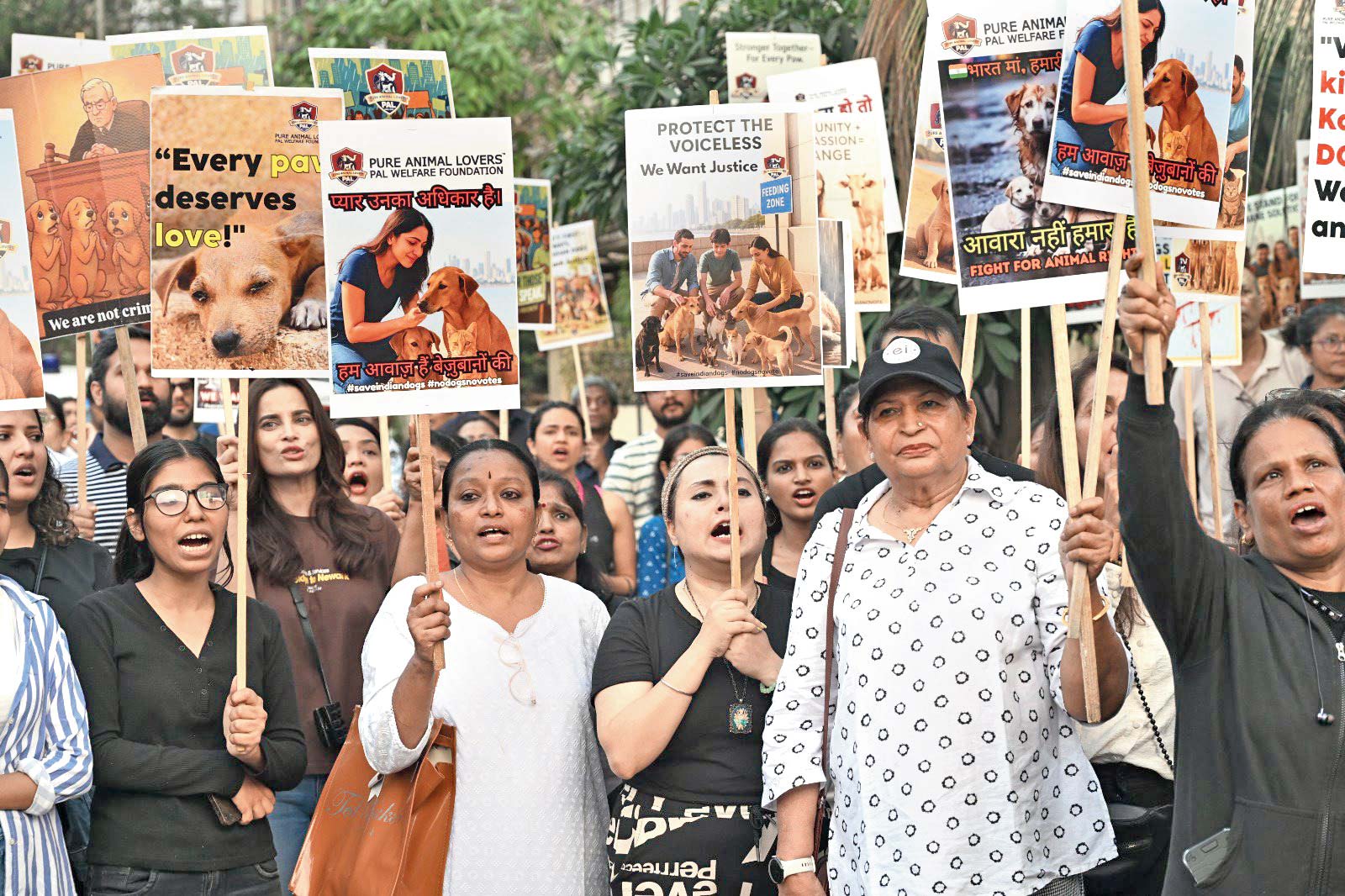 સુપ્રીમ કોર્ટે શેરીઓમાં રખડતા કૂતરાઓને પકડીને શેલ્ટરમાં રાખવાનો આદેશ આપ્યા બાદ પ્રાણીપ્રેમીઓ કોર્ટના આ આદેશથી નારાજ છે. તેમનું કહેવું છે કે પ્રાણીઓને પણ જીવવાનો અધિકાર છે. પ્રાણીપ્રેમીઓની સંસ્થા પ્યૉર ઍનિમલ લવર્સ દ્વારા ગઈ કાલે અંધેરી લોખંડવાલામાં આ બાબતે હાથમાં પ્લૅકાર્ડ્સ લઈને જોરદાર પ્રદર્શન કરવામાં આવ્યું હતું. તસવીરઃ સતેજ શિંદે