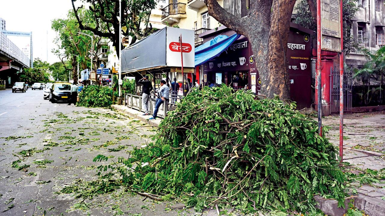 બસ-સ્ટૉપ પર લોકો બસની રાહ જોતા ઊભા હોય ત્યારે ઝાડની ડાળીઓ તેમના પર ન પડે એ માટે બસ-સ્ટૉપ પાસેનાં વૃક્ષોનું ટ્રિમિંગ કરવામાં આવી રહ્યું છે. તસવીર : આશિષ રાજે
