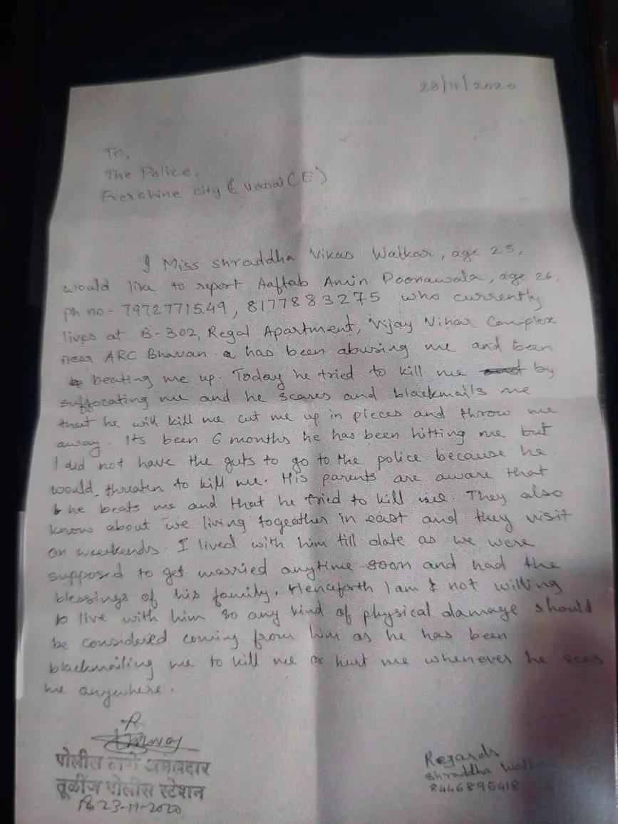 શ્રદ્ધા વાલકરે ૨૩ નવેમ્બર ૨૦૨૦ના રોજ તુલિંજ પોલીસ સ્ટેશનને પત્ર લખ્યો હતો. આ પત્રમાં શ્રદ્ધાએ જણાવ્યું હતું કે, આફતાબે તેની સાથે મારપીટ કરી હતી. ગળું દબાવીને મારી નાખવાનો પ્રયાસ કર્યો હતો. એટલું જ નહીં, આફતાબે તેને જાનથી મારી નાખવાની અને ટૂકડા કરી નાખવાની ધમકી આપી હતી. તે સતત શ્રદ્ધાને બ્લેકમેલ કરતો હતો.