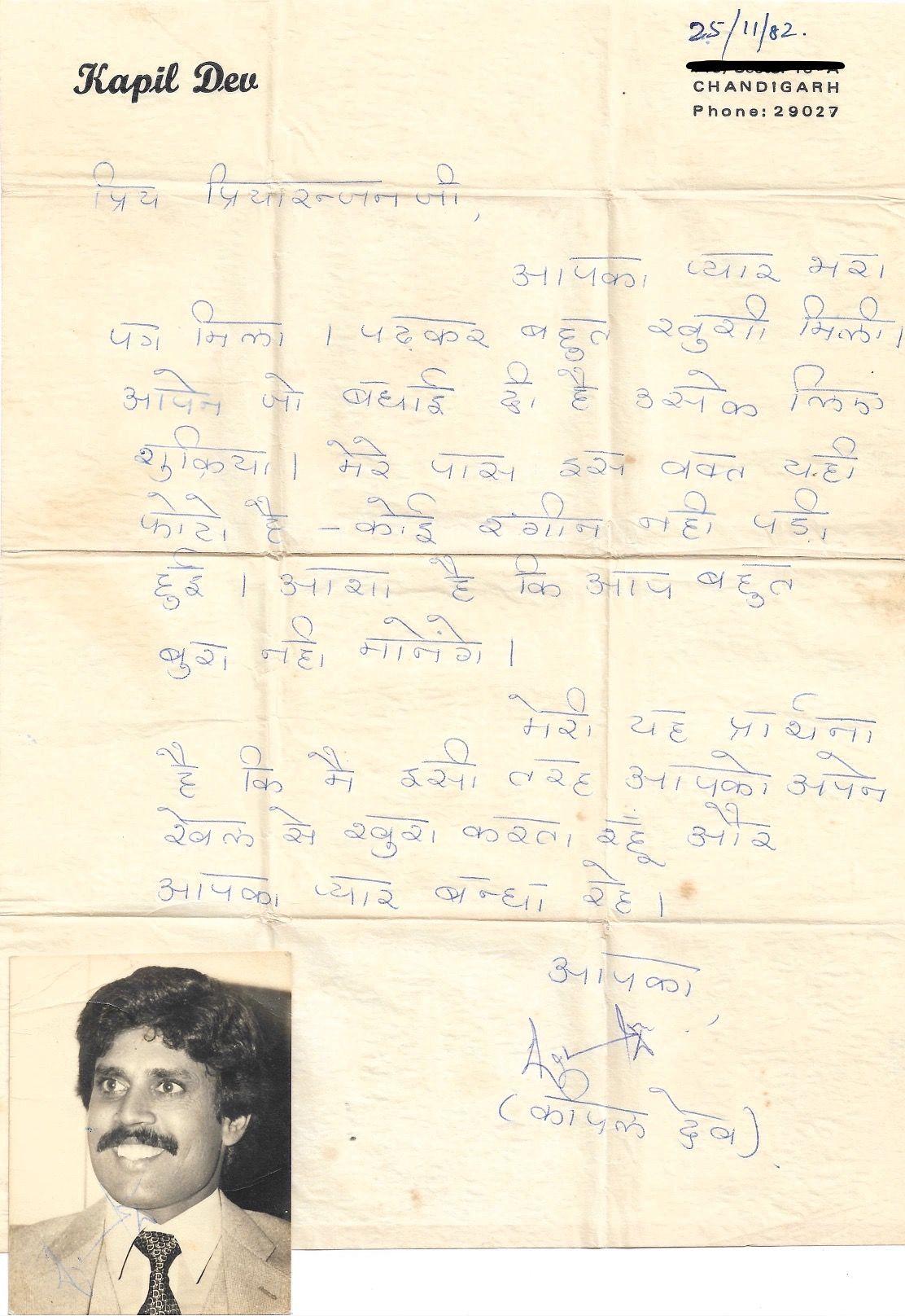 કપિલ દેવે તેમને મોકલેલા પત્રની ઇમેજ તેમણે પોસ્ટમાં સાથે મૂકી છે. હિંદીમા લખાયેલો આ પત્ર કપિલ દેવના લેટર હેડ પર છે અને તેમણે નાનકડા બાળકને પણ બહુ સન્માનીય રીતે સંબોધન કર્યું છે જે તમે આ પોસ્ટમાં જોઇ શકો છો. પ્રિય પ્રિયરંજનની, તમારો પ્રેમ ભર્યો પત્ર મળ્યો, વાંચીને ખુશી થઇ, તમે આપેલી શુભેચ્છાઓ બદલ આભાર. હાલમાં મારી પાસે આ એક બ્લેક એન્ડ વ્હાઇટ ફોટો જ છે – કોઇ રંગીન ફોટો નથી પડ્યો. આશા છે કે તમને બહુ ખોટું નહીં લાગે.મારી પ્રાર્થના છે કે હું તમને મારા ખેલથી આ રીતે ખુશ કરતો રહું અને તમારો પ્રેમ કાયમ રહે, આપનો કપિલ દેવ.