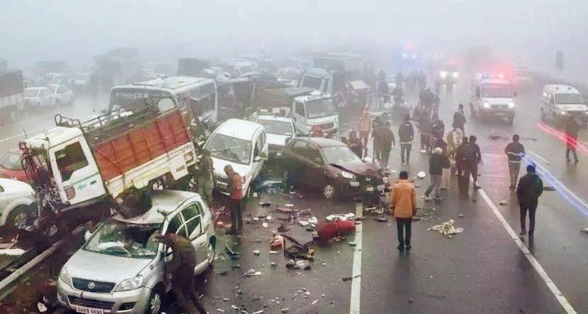 ગઈ કાલે વહેલી સવારે પાંચ વાગ્યે દિલ્હી-મુંબઈ એક્સપ્રેસવે પર એક પછી એક વીસથી પચીસ વાહનો ટકરાયાં હતાં જેમાં બે પોલીસ સહિત ૪ લોકોએ જીવ ગુમાવ્યો હતો. ધુમ્મસને લીધે ઓછી વિઝિબિલિટીના કારણે એક્સપ્રેસવે પર પહેલાં બે ટ્રક વચ્ચે મોટો અકસ્માત થયો હતો. ત્યાર બાદ આ ટ્રકોની સાથે જામફળ ભરેલી એક ટ્રક અથડાઈ હતી અને એ ઊંધી વળી ગઈ હતી. એને પરિણામે એક્સપ્રેસવે પર જામફળ વેરાયાં હતાં અને રોડ એકદમ સ્લિપરી થઈ ગયો હતો એટલે બ્રેક ન લાગવાથી વાહનોની ટક્કર થવા લાગી હતી. થોડી જ વારમાં વીસથી પચીસ વાહનો એકબીજા સાથે ટકરાયાં હતાં.