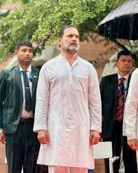 રાહુલ વરસાદ પડતો હોવા છતાં છત્રી વગર જોવા મળ્યા હતા