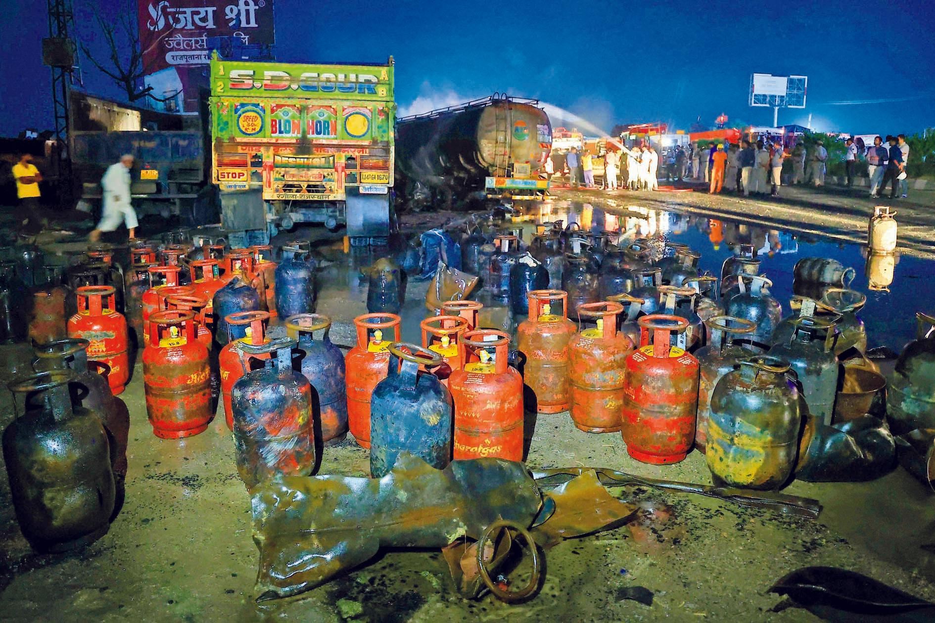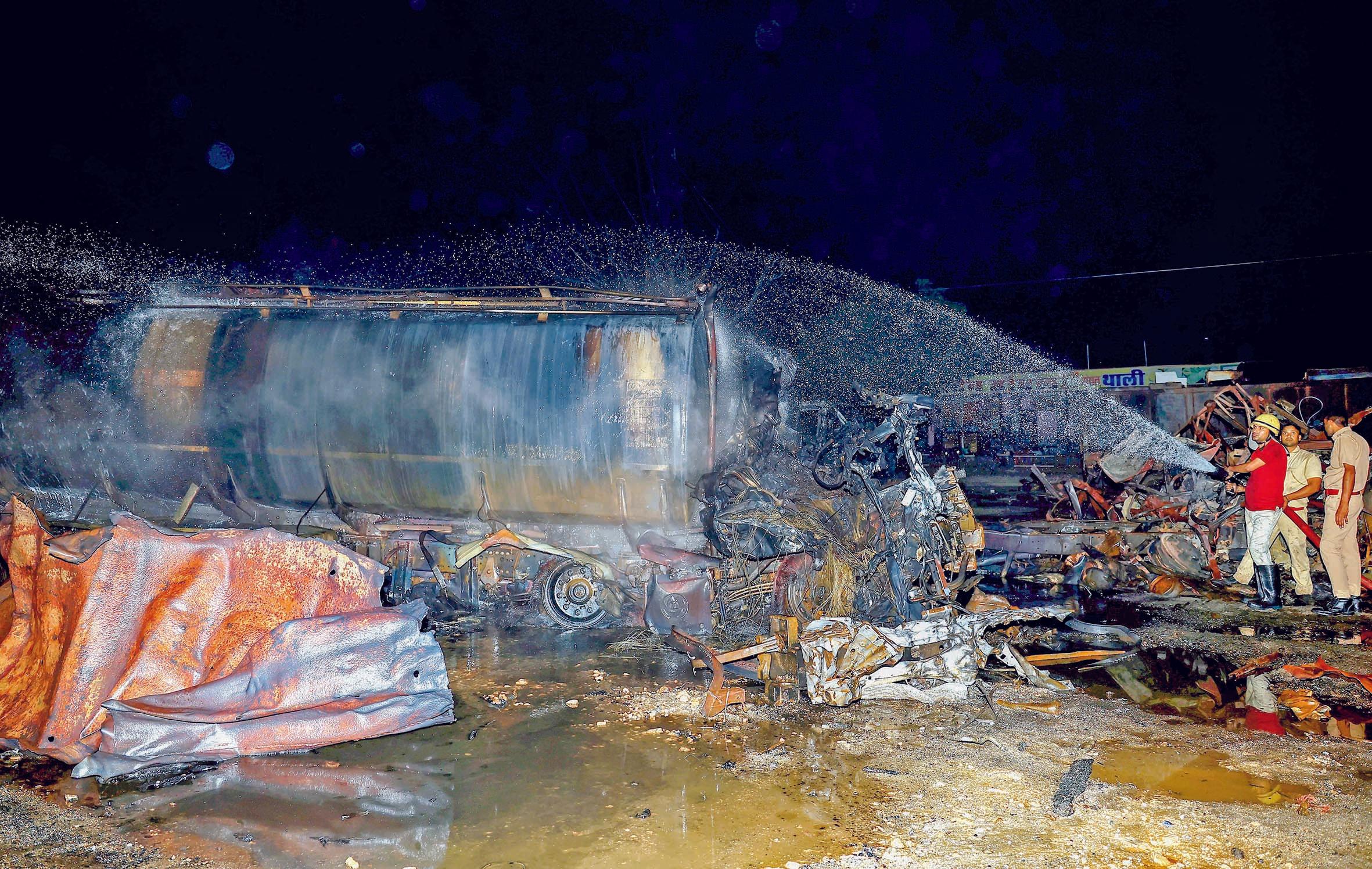 રાજસ્થાનમાં જયપુર-અજમેર હાઇવે પર મંગળવારે રાતે ૧૦ વાગ્યે ભયાવહ શબ્દને નાનો કહેવડાવે એવી ભીષણ આગની ઘટના ઘટી. સાવરદા પુલિયા પાસે એક ઢાબા પાસે સિલિન્ડર ભરેલી ટ્રકનો ડ્રાઇવર ટ્રક ઊભી રાખીને જમવા ગયો હતો. એ વખતે અજમેરથી જયપુર તરફ જતું કેમિકલ ભરેલું ટૅન્કર પાછળથી આવીને જોરથી ટ્રકને અથડાયું. ટૅન્કર એટલું જોરથી અથડાયું કે એની કૅબિન ટ્રકની અંદર ચીપકી ગઈ હોવાથી ડ્રાઇવર ફસાઈ ગયો. જોરદાર અથડામણને કારણે ટૅન્કરની કૅબિનમાંથી નાની ચિનગારીઓ નીકળવા લાગી. આ ટક્કર લાગી એ પછી ૨૧ મિનિટ સુધી આગ નહોતી લાગી, પરંતુ ટૅન્કરની કૅબિનમાંથી નીકળેલી એક ચિનગારી ટ્રકમાંના એક સિલિન્ડરને લાગી અને સિલિન્ડર હવામાં ઊછળીને ફાટ્યું.