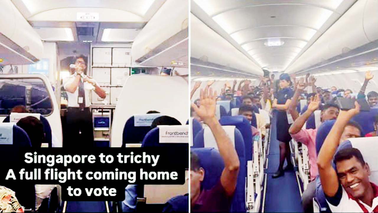 મુસાફરોથી ભરેલી સિંગાપોરથી ત્રિચી આવતી ફ્લાઇટનો વિડિયો સોશ્યલ મીડિયામાં વાઇરલ થયો છે. આ ક્લિપ વધતી જતી મતદાતા-જાગૃતિને પ્રતિબિંબિત કરે છે. આ વિડિયો કૅપ્ટન પ્રદીપ કૃષ્ણને ઇન્સ્ટાગ્રામ પર શૅર કર્યો હતો. આ વિડિયોની કૅપ્શનમાં તેમણે લખ્યું હતું કે જો લોકો મતદાનના દિવસે ચૂપ રહે તો ભવિષ્ય વિશે ફરિયાદ ન કરવી જોઈએ.