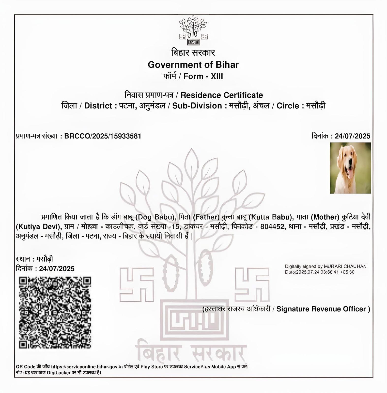 બિહારમાં SIRને લઈને અભિયાન ચલાવવામાં આવી રહ્યું છે. આને લઈને લોકો પોતાના દસ્તાવેજ કરેક્ટ કરવા-કરાવવામાં લાગેલા છે. એવામાં અજબ ગજબ દસ્તાવેજો પણ સામે આવી રહ્યા છે. રાજધાની પટના નજીક મસૌઢીમાં `ડૉગ બાબૂ`ને RTPS પોર્ટલે સ્પેશિયલ ટ્રીટમેન્ટ આપી દીધી છે અને રેસિડેન્શિયલ સર્ટિફિકેટ પણ જારી કરવામાં આવ્યું છે. સ્ટોરી થોડી અજીબ છે, પણ સો ટકા સાચી છે.