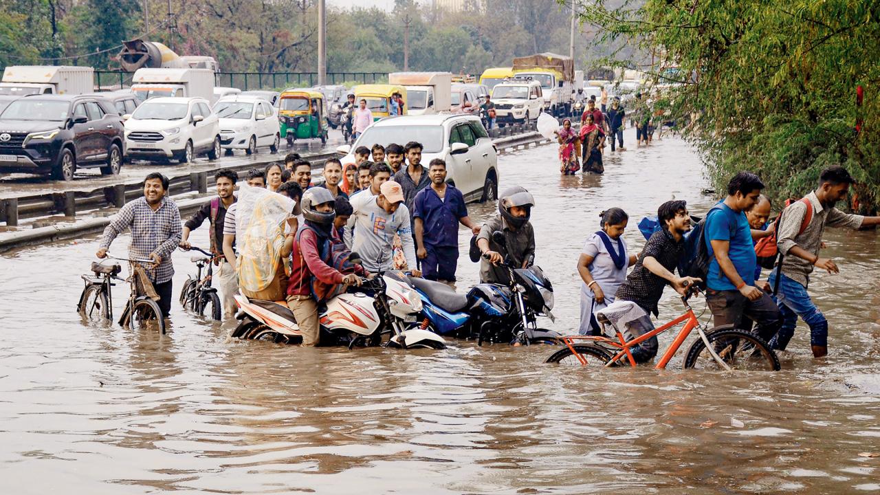 ગુરુગ્રામમાં ગઈ કાલે ભારે વરસાદ બાદ પાણીમાં સમાઈ ગયેલા દિલ્હી-ગુરુગ્રામ એક્સપ્રેસવેમાંથી પસાર થઈ રહેલા લોકો. દિલ્હી-એનસીઆર રીજનમાં સૌથી વધુ વરસાદ ગુરુગ્રામમાં પડ્યો છે. દિલ્હીના અનેક વિસ્તારોમાં પણ ગઈ કાલે વરસાદ અને કરા પડ્યા હતા, જેને લીધે તાપમાનમાં ઘટાડો થયો છે.