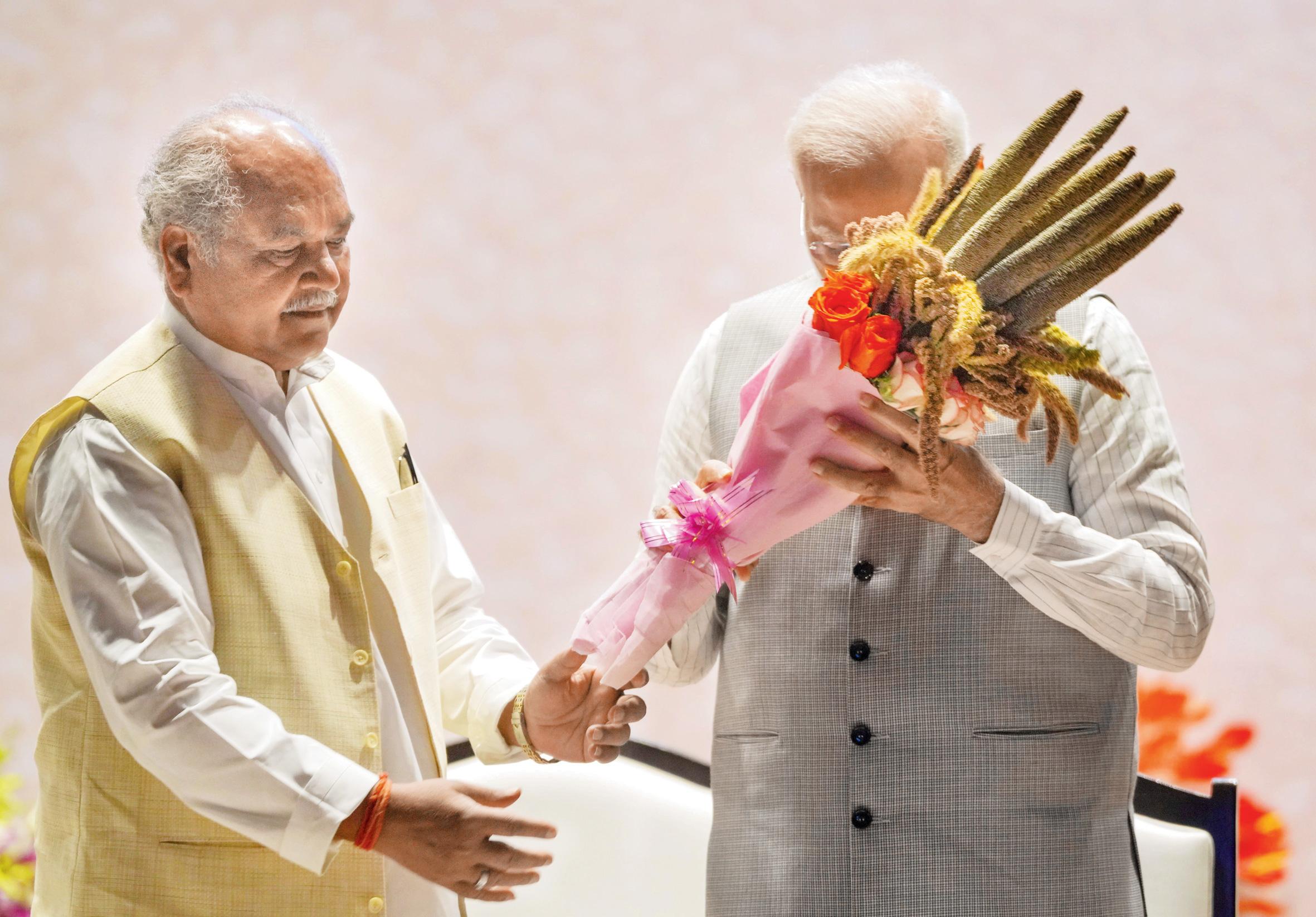 નવી દિલ્હીમાં ગઈ કાલે વૈશ્વિક જાડા ધાન્ય પરિષદના ઉદ્ઘાટન દરમ્યાન કેન્દ્રીય કૃષિપ્રધાન નરેન્દ્ર સિંહ તોમર પાસેથી જાડા ધાન્યનો બુકે મેળવતા વડા પ્રધાન નરેન્દ્ર મોદી. વડા પ્રધાને આ પરિષદમાં કહ્યું હતું કે જાડા ધાન્ય અન્ન સુરક્ષાના પડકારનો સામનો કરવામાં મદદ કરી શકે છે અને ભારત જાડા ધાન્ય કે શ્રી અન્નને પ્રમોટ કરવા માટે સતત કામ કરી રહ્યું છે.