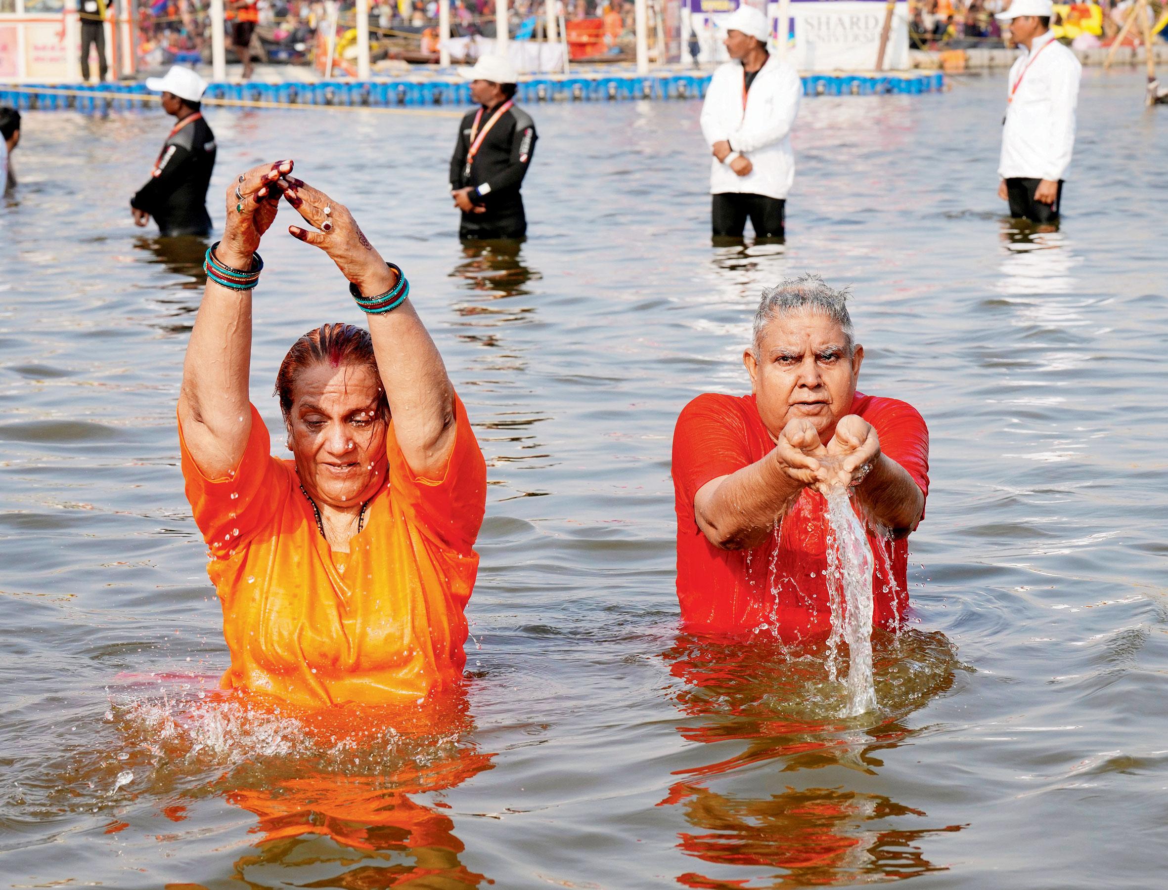 મહાકુંભમાં ઉપરાષ્ટ્રપતિ જગદીપ ધનખડ અને તેમનાં પત્ની સુદેશે શનિવારે સંગમસ્નાન કર્યું હતું.