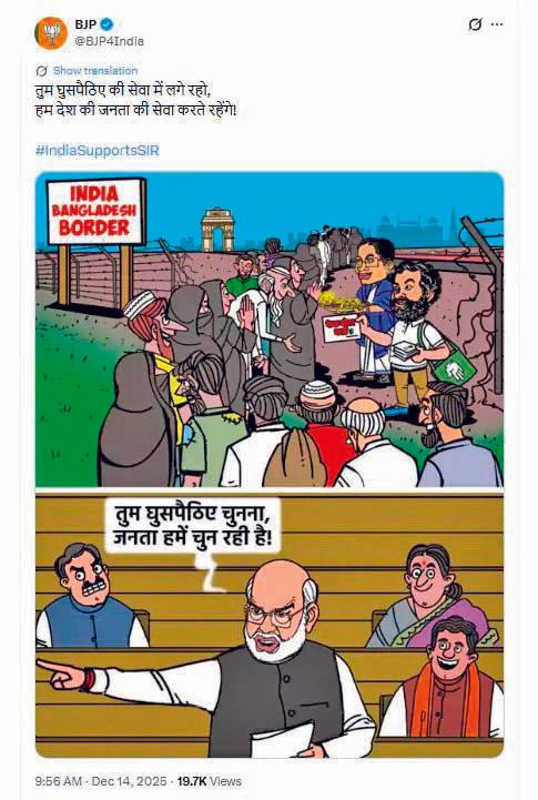 રામલીલા મેદાનમાં જે બેફામ આરોપો થયા એના જવાબમાં BJPએ સોશ્યલ મીડિયા પર એક કાર્ટૂન પોસ્ટ કરીને લખ્યું હતું કે તમે ઘૂસણખોરોની સેવામાં લાગેલા રહો, અમે દેશની જનતાની સેવા કરીશું.