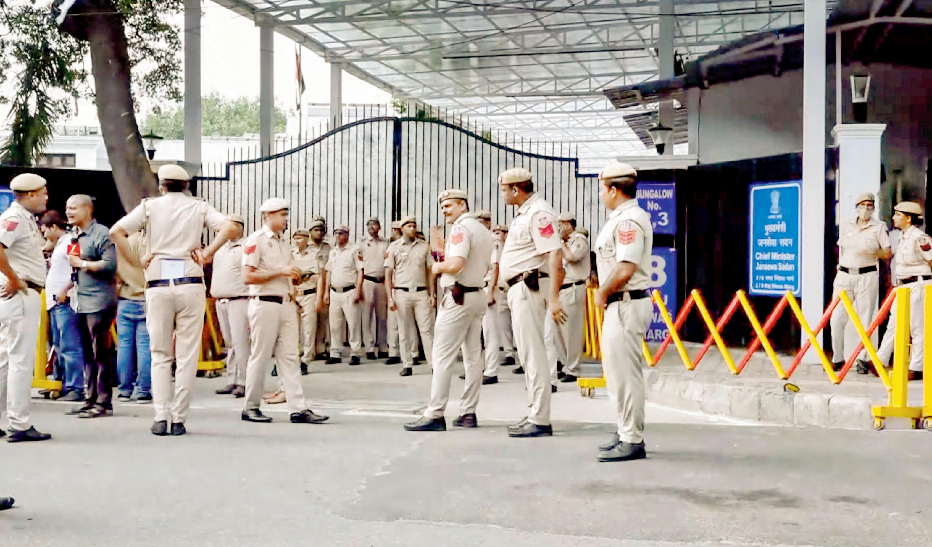 ગઈ કાલે હુમલા પછી દિલ્હીના મુખ્ય પ્રધાન રેખા ગુપ્તાના સત્તાવાર નિવાસસ્થાનની બહાર સતર્ક પોલીસ.