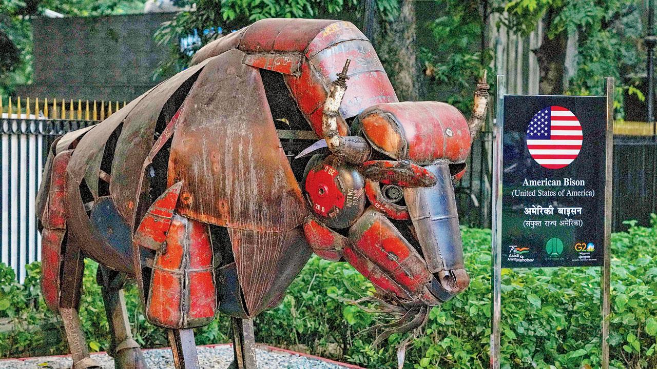 દિલ્હીમાં વેસ્ટ મટીરિયલ્સમાંથી બનાવવામાં આવેલી બાઇસન પ્રાણીની પ્રતિકૃતિ.