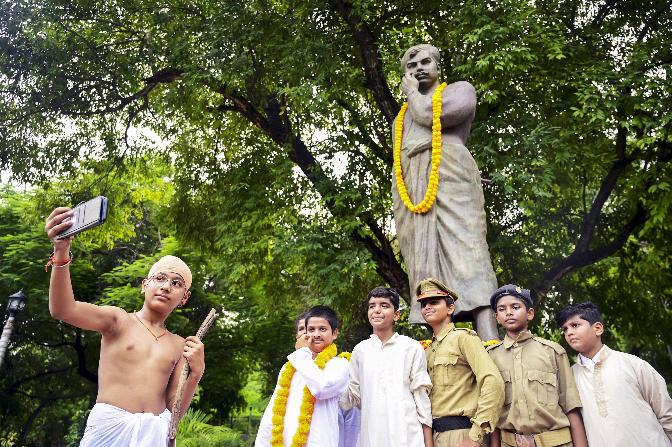 ક્રાન્તિકારી ચંદ્રશેખર આઝાદની જન્મજયંતીએ ગઈ કાલે પ્રયાગરાજમાં તેમની પ્રતિમા સાથે દેશપ્રેમી બાળકોએ સ્વાતંયસૈનિકોની વેશભૂષામાં તસવીરો ખેંચાવી હતી.