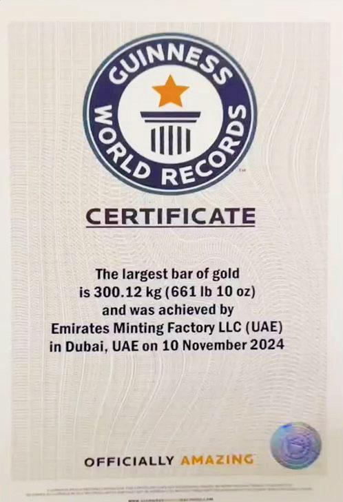 જગતના સૌથી મોટા ગોલ્ડ બારનો વિશ્વવિક્રમ ઑલમોસ્ટ ૨૦ વર્ષ પછી તૂટ્યો છે. દુબઈની કંપનીએ બનાવેલો ગોલ્ડ બાર અગાઉના બાર કરતાં પચાસ કિલો વધુ વજનનો છે. આ પહેલાં જૂન ૨૦૦૫માં મિત્સુબિશી મટીરિયલ્સ કૉર્પોરેશન દ્વારા બનાવવામાં આવેલો ગોલ્ડ બાર સૌથી મોટો હતો. નવા રેકૉર્ડ-બ્રેકિંગ ગોલ્ડ બારની ખાસિયત એ છે કે એની શુદ્ધતાનો આંક ૯૯૯.૯ છે.