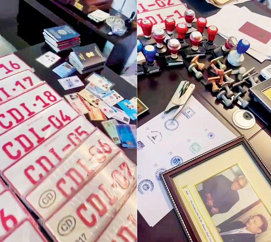 જપ્ત કરવામાં આવેલાં નંબર પ્લેટ્સ અને રબર-સ્ટૅમ્પ્સ.