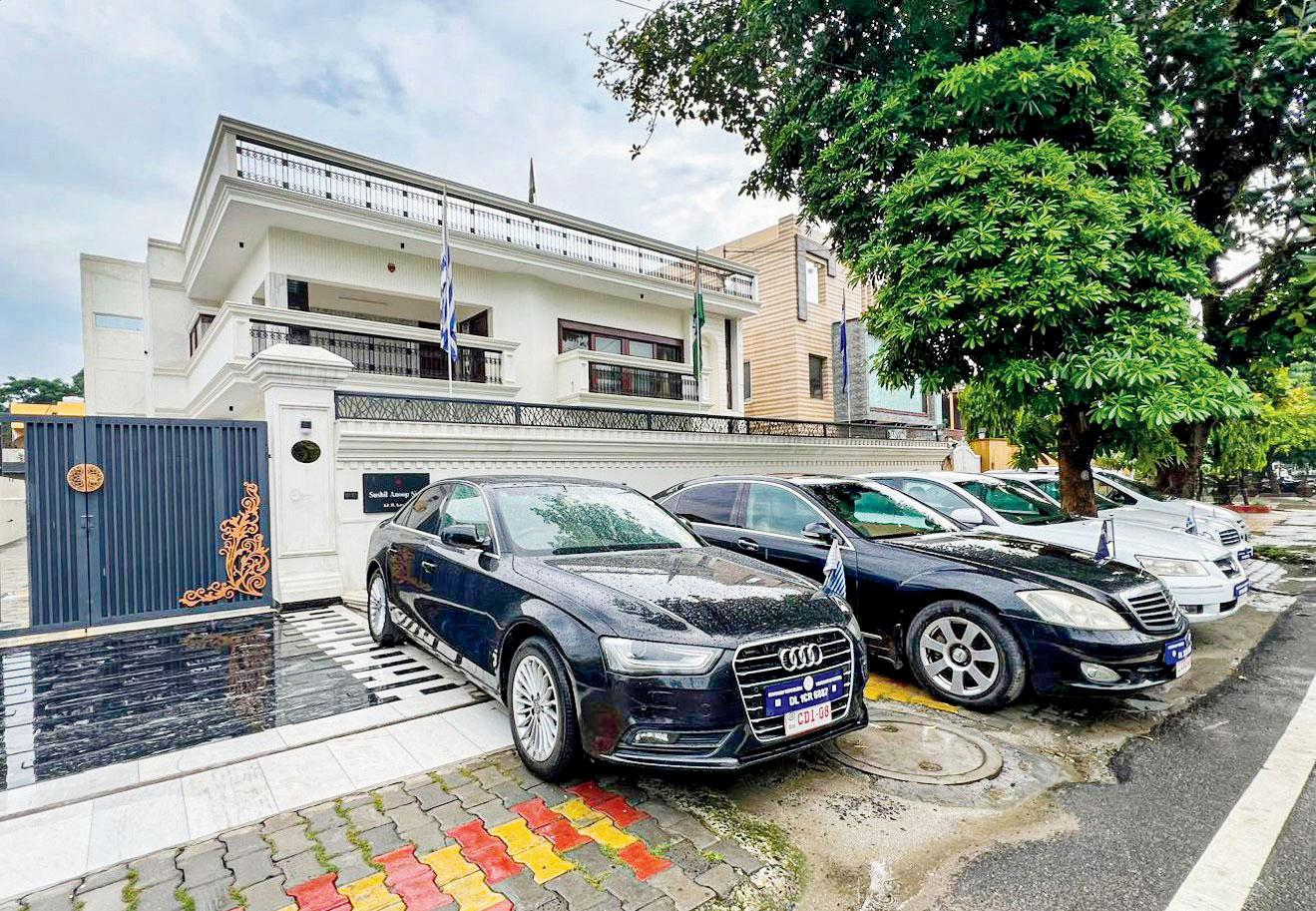 ગાઝિયાબાદના કવિનગરમાં બનાવટી દૂતાવાસ માટે ભાડે લેવાયેલો બંગલો અને બહાર ઊભેલી રાજદ્વારી નંબર-પ્લેટવાળી લક્ઝરી ગાડીઓ.