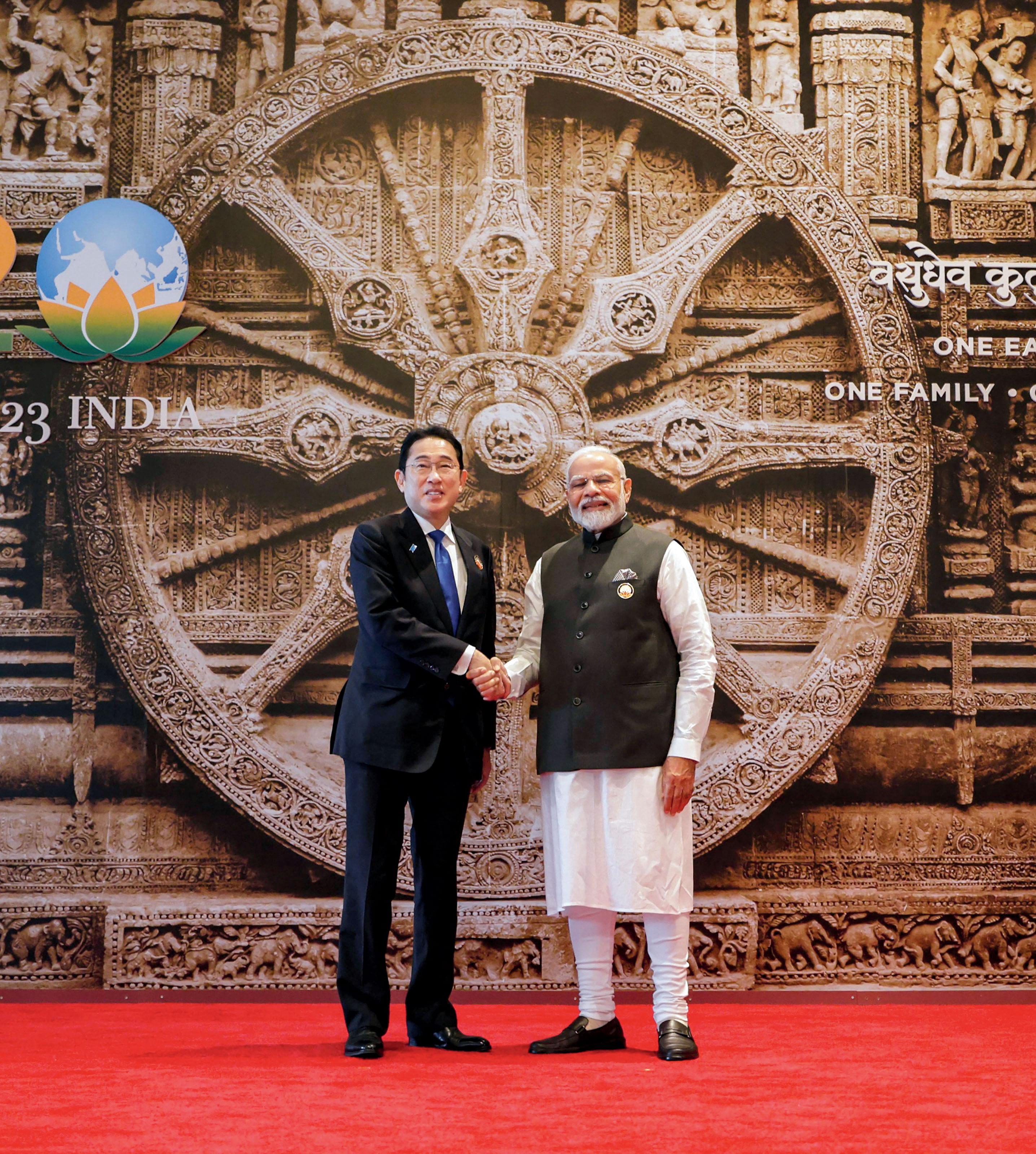 નવી દિલ્હીમાં ગઈ કાલે G20 સમિટ માટે ભારત મંડપમ ખાતે જપાનના પીએમ ફુમિયો કિશિદાને આવકારી રહેલા વડા પ્રધાન નરેન્દ્ર મોદી (તસવીર : પી.ટી.આઇ.)