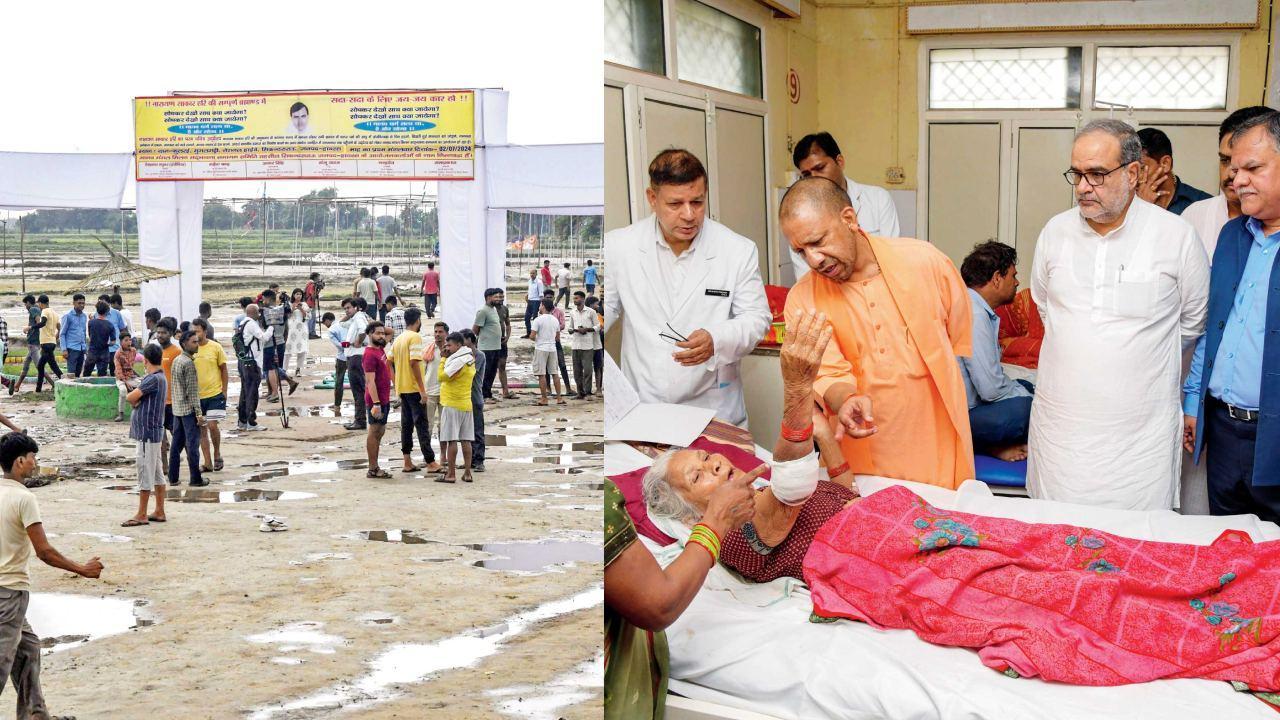 જ્યાં નાસભાગ થઈ હતી એ સત્સંગનું સ્થળ, ગઈ કાલે ત્યાં ઘણા લોકો એકઠા થયા હતા. અને બીજી તસવીરમાં નાસભાગમાં ઘવાયેલી મહિલાના ગઈ કાલે હાથરસમાં ખબરઅંતર પૂછતા યોગી આદિત્યનાથ.