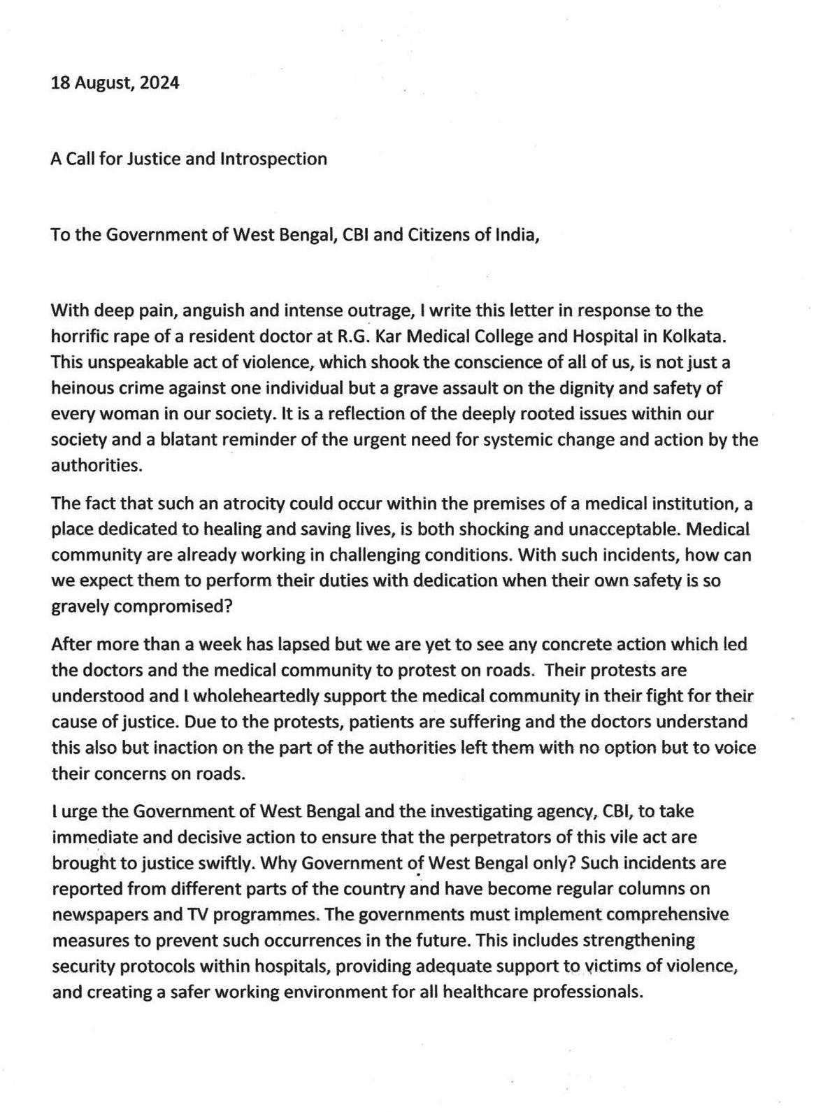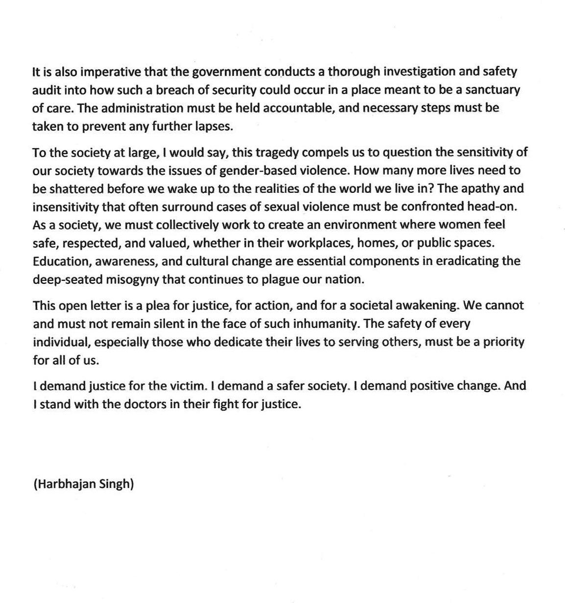 આ પત્રમાં હરભજન સિંહે જણાવ્યું છે કે ‘મેં આ પત્રમાં કલકત્તાની ઘટનામાં પીડિતાને જલદી ન્યાય મળે એની અપીલ કરી છે. આ હિંસાત્મક ઘટના છે જેના વિશે કંઈ કહી શકાય એમ નથી. આ ઘટનાએ અંતરાત્માને હલાવી દીધો છે. આ માત્ર એક સ્ટુડન્ટ સાથે બનેલી ઘટના નથી, પણ સમાજમાં રહેતી તમામ મહિલાની સુરક્ષા પર પ્રહાર છે. આપણા સમાજમાં વ્યાપ્ત બૂરાઈનું આ પ્રતિબિંબ છે. આ એ અલાર્મ છે જે દર્શાવે છે કે અધિકારીઓ દ્વારા આપણી સિસ્ટમમાં બદલાવ લાવવાની જરૂર છે. આ ઘટનાને એક અઠવાડિયા કરતાં વધારે સમય થયો છે છતાં કોઈ નક્કર કાર્યવાહી થઈ નથી. ડૉક્ટરો વિરોધ-પ્રદર્શન કરી રહ્યા છે અને હું તેમના સપોર્ટમાં છું. મેડિકલ સમાજ સાથે છું, તેઓ મુશ્કેલ પરિસ્થિતિમાં કામ કરી રહ્યા છે. આવી સ્થિતિમાં તેમની સુરક્ષા દાવ પર છે. આવામાં આપણે કેવી રીતે આશા રાખીએ કે તેઓ પૂર્ણ પ્રતિબદ્ધતાથી કામ કરી શકશે? આ કેસમાં સરકારી તપાસ એજન્સી પણ જલદી કાર્યવાહી કરીને ન્યાય અપાવે એવી મારી અપીલ છે.’