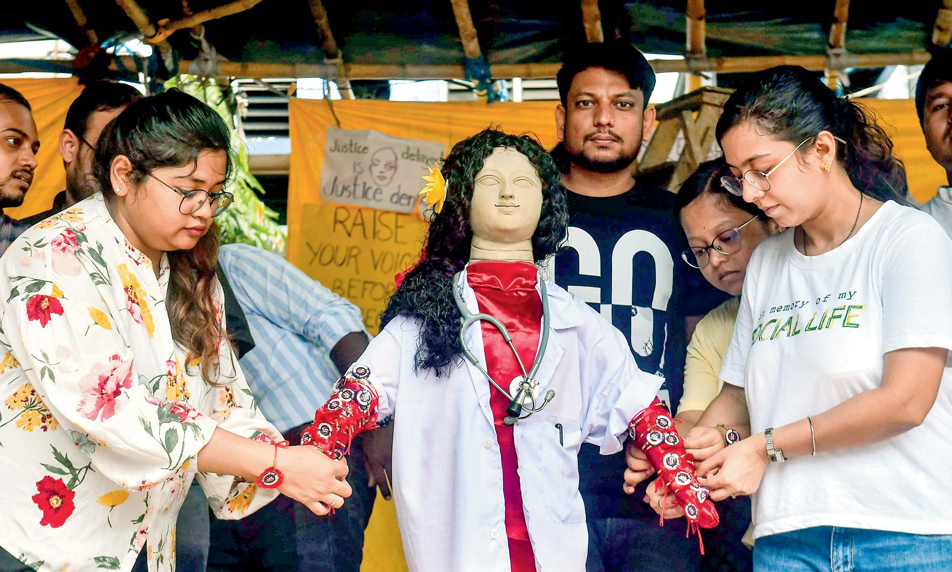 ગઈ કાલે કલકત્તામાં વિરોધ કરતા ડૉક્ટર્સે આર. જી. કર મેડિકલ કૉલેજ ઍન્ડ હૉસ્પિટલમાં જીવ ગુમાવનારી ટ્રેઇની ડૉક્ટરનું પૂતળું બનાવીને એને રાખડી બાંધી હતી