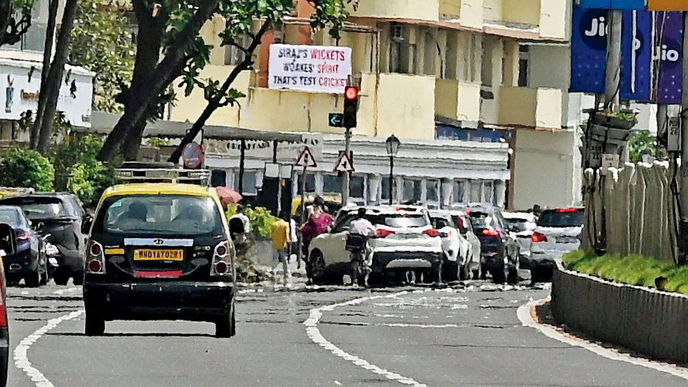 સામાન્ય રીતે સખત ગરમી હોય અને પ્રવાસ કરતા હોઈએ ત્યારે રસ્તા પર આગળ સહેજ દૂર પાણી હોવાનો ભ્રમ થતો હોય છે જેને મૃગજળ કહેવાય છે. હાલ તો વરસાદની મોસમ છે પણ ગઈ કાલે બપોરે વાદળો પણ છવાયાં હતાં અને ભેજ પણ હોવાને કારણે બફારો થતો હતો ત્યારે મરીન ડ્રાઇવની સડકો પર મૃગજળ હોવાનો ભાસ થતો હતો જે કૅમેરામાં આબાદ ઝિલાઈ ગયો હતો. તસવીર : આશિષ રાજે