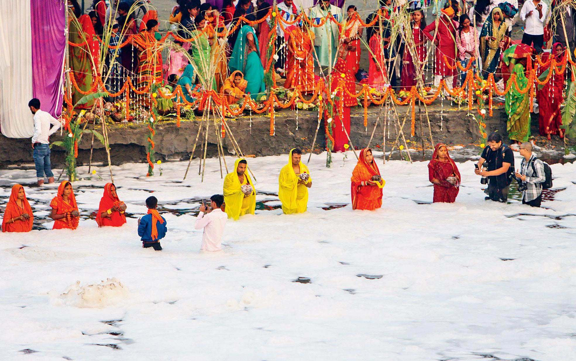 નવી દિલ્હી : નવી દિલ્હીમાં ગઈ કાલે કાલિંદી કુંજ ખાતે પ્રદૂષિત યમુના નદીની સપાટી પર ઝેરી ફીણ તરી રહ્યું હતું ત્યારે એવા પાણીમાં શ્રદ્ધાળુઓએ છઠપૂજા ફેસ્ટિવલ માટે પૂજા કરી હતી. નોંધપાત્ર છે કે દિલ્હીમાં હવાના પ્રદૂષણની સાથે યમુનાનું જળ પણ ખૂબ પ્રદૂષિત છે.
