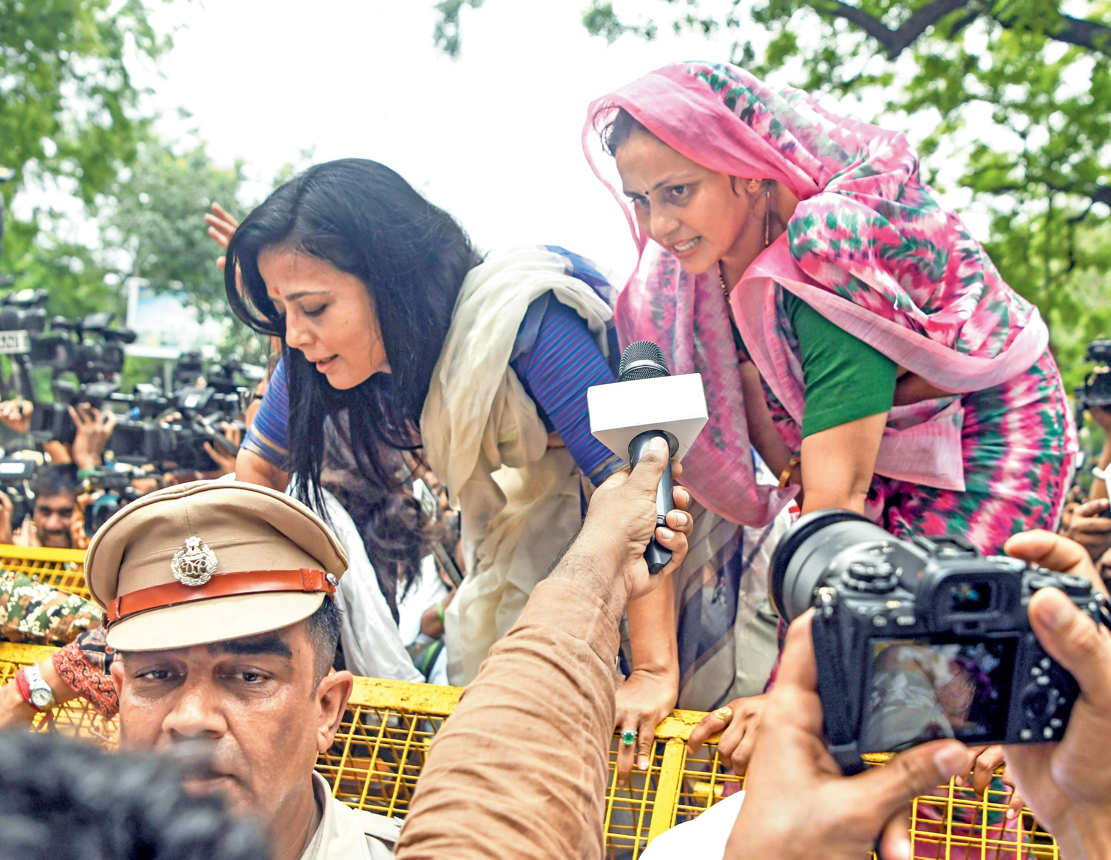 TMCનાં મહુઆ મોઇત્રા અને કૉન્ગ્રેસનાં સાંસદ સંજના જાટવ બૅરિકેડ ઓળંગીને ઇલેક્શન કમિશનની ઑફિસ તરફ આગળ વધ્યાં હતાં.