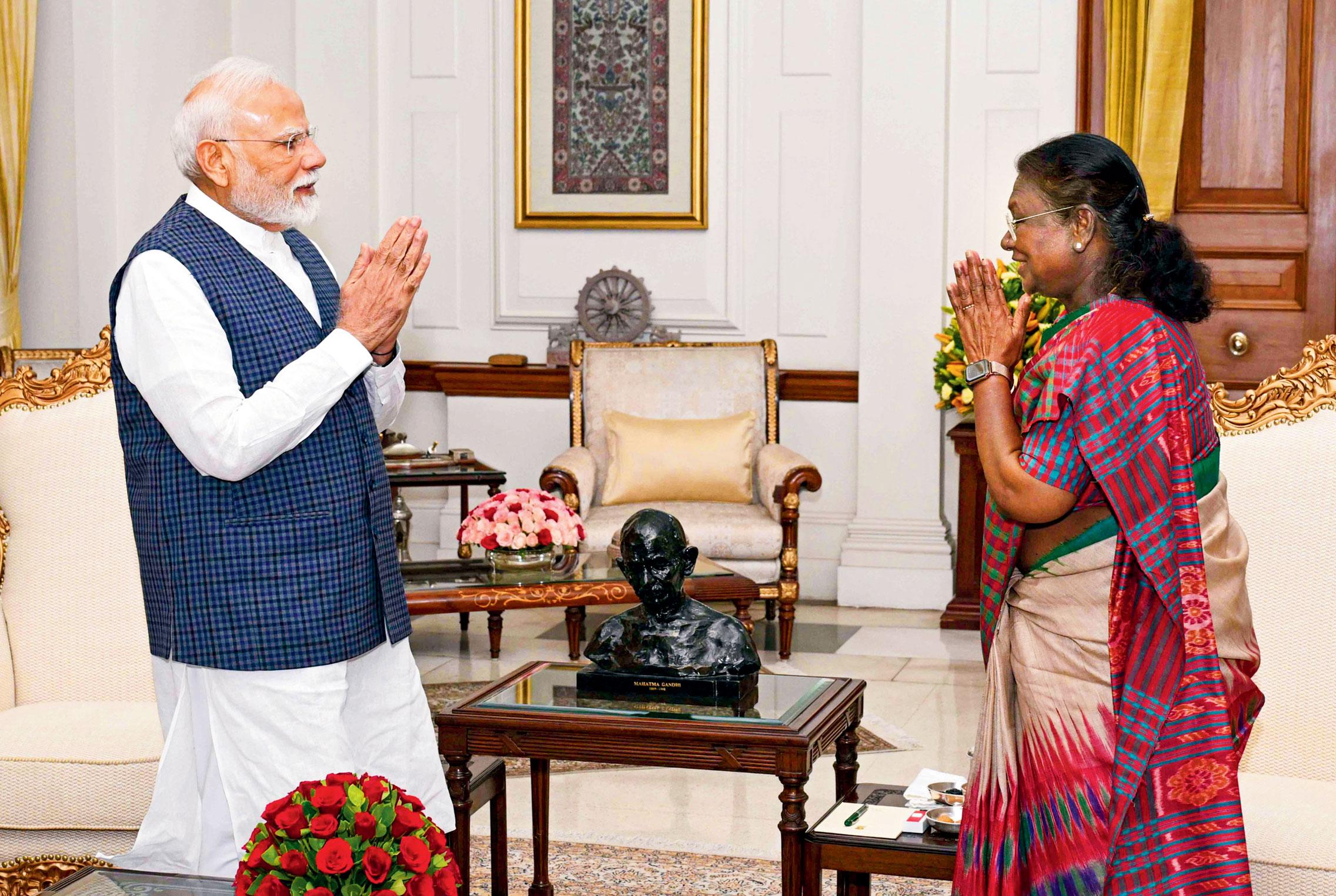 કૅબિનેટની બેઠક પછી રાષ્ટ્રપતિ દ્રૌપદી મુર્મુને મળવા પહોંચેલા નરેન્દ્ર મોદી.