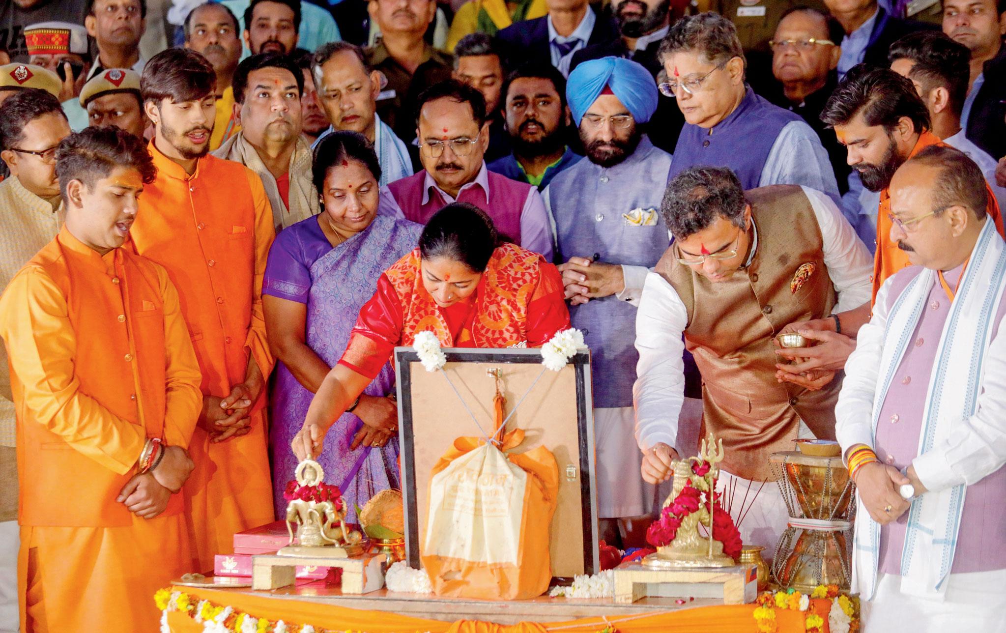ગઈ કાલે દિલ્હીમાં વાસુદેવ ઘાટ પર પોતાના કૅબિનેટ મિનિસ્ટરો સાથે યમુના આરતી કરતાં રેખા ગુપ્તા.