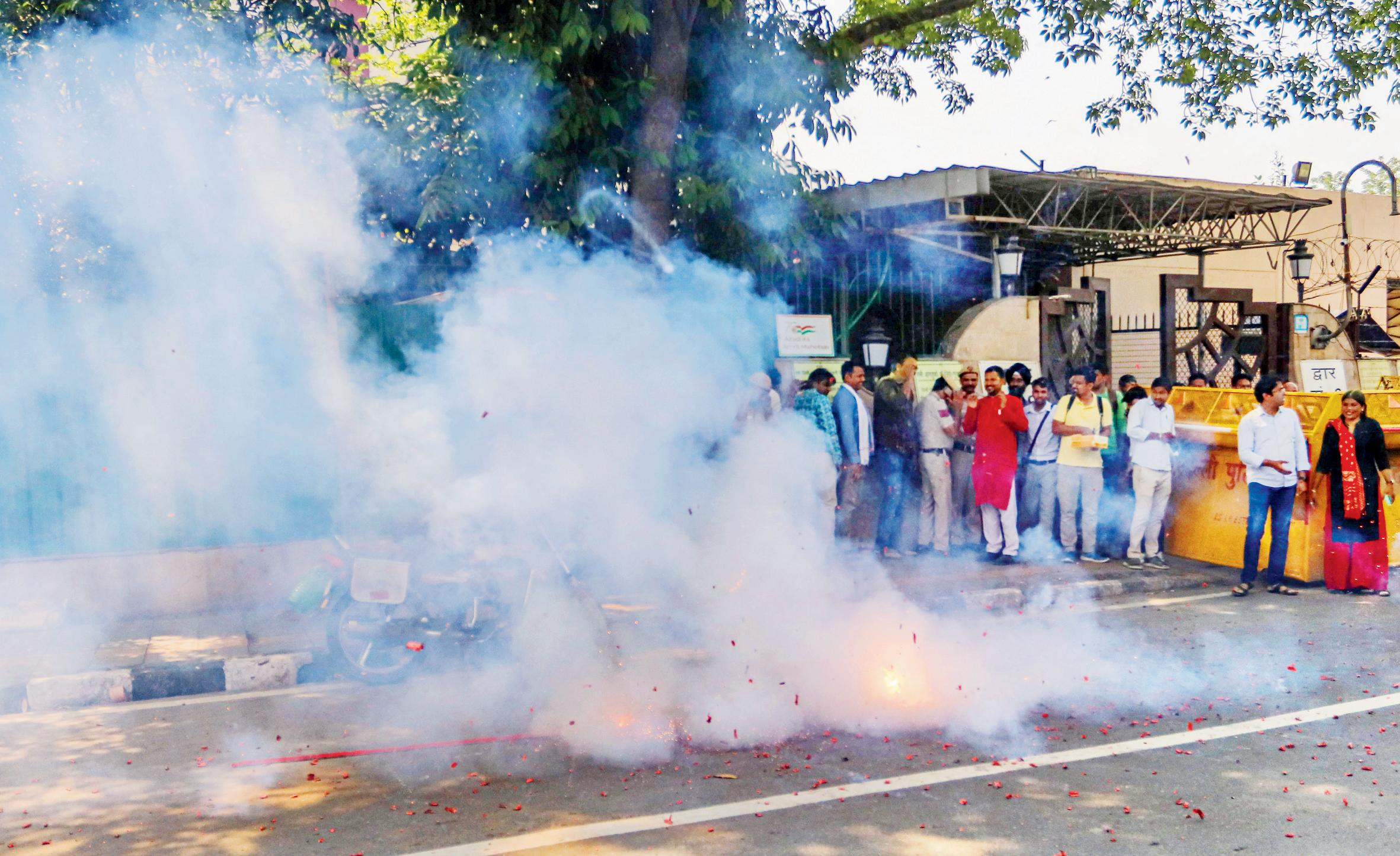 નવી દિલ્હીમાં ગઈ કાલે ફટાકડા ફોડીને સેલિબ્રેશન કરી રહેલા આમ આદમી પાર્ટીના લીડર્સ અને સપોર્ટર્સ. તસવીર પી.ટી.આઇ.