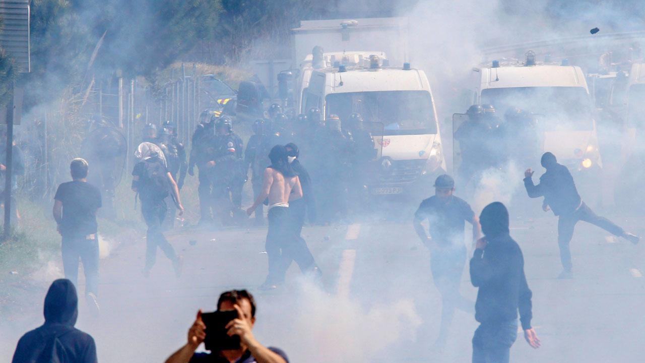 ફ્રાન્સના બેયોન્નેમાં ગઈ કાલે એક વિરોધ-રૅલી દરમ્યાન પોલીસ સાથે અથડામણ કરી રહેલા પ્રદર્શનકર્તાઓ. સંસદમાં મતદાન વિના સરકાર દ્વારા રિટાયરમેન્ટની એજમાં વધારો કરતાં લોકો રોષે ભરાયા છે. આ મામલે વિરોધ પ્રદર્શન આક્રમક બન્યું છે.