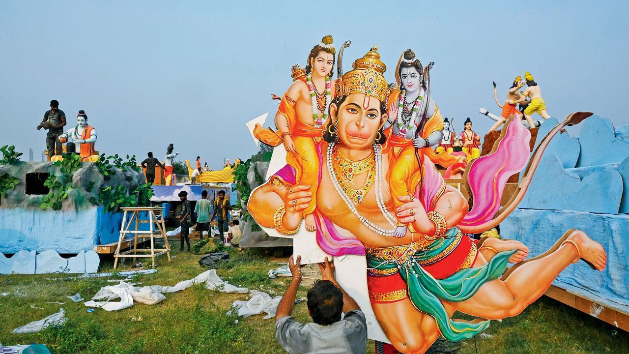અયોધ્યામાં આજે નીકળનારી શોભાયાત્રા માટે ઝાંકીઓની તૈયારી કરતા આર્ટિસ્ટ.