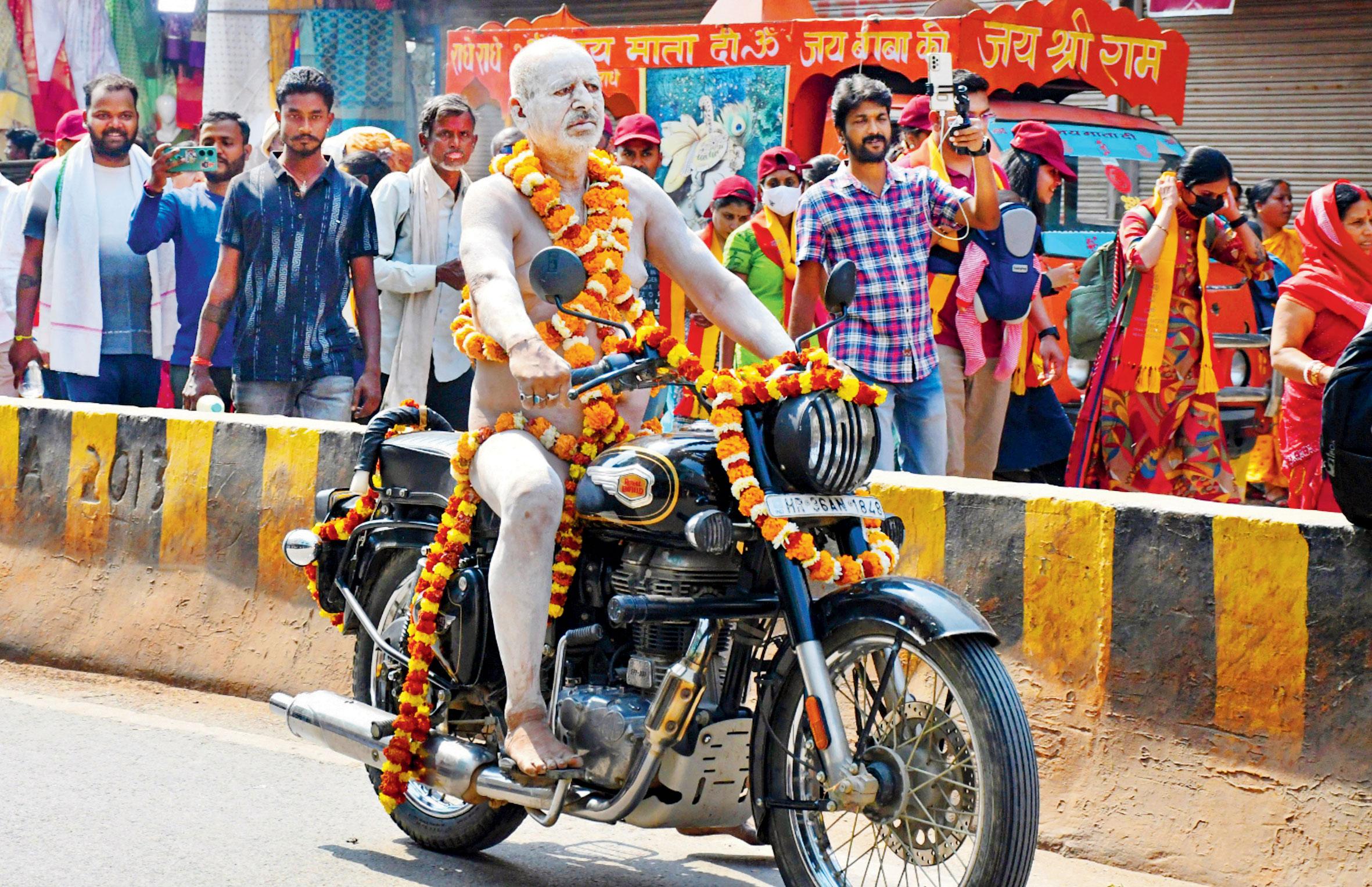 ગઈ કાલે વારાણસીમાં દશાશ્વમેધ ઘાટ નજીક બુલેટ ચલાવતા જોવા મળેલા શ્રી પંચદશનામ આવાહન અખાડાના એક નાગા સાધુ.