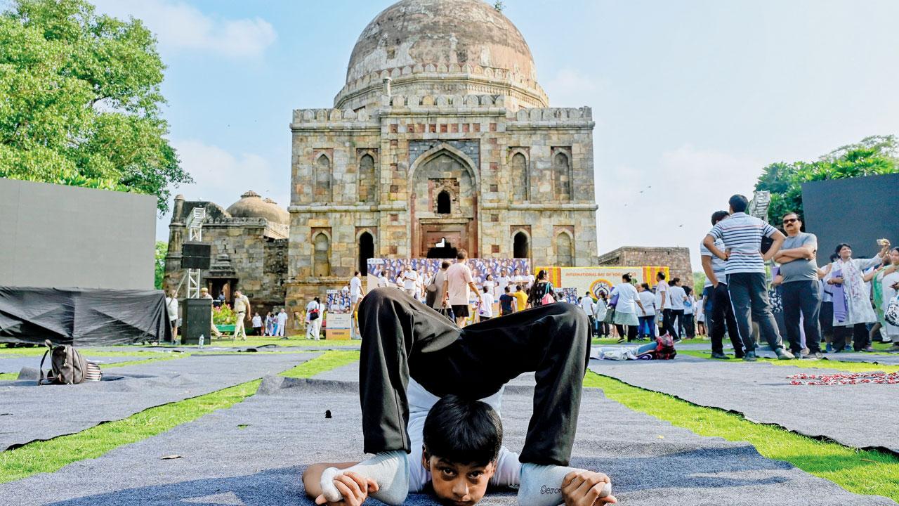 દિલ્હીમાં લોધી ગાર્ડનમાં યોગ કરતો છોકરો.
