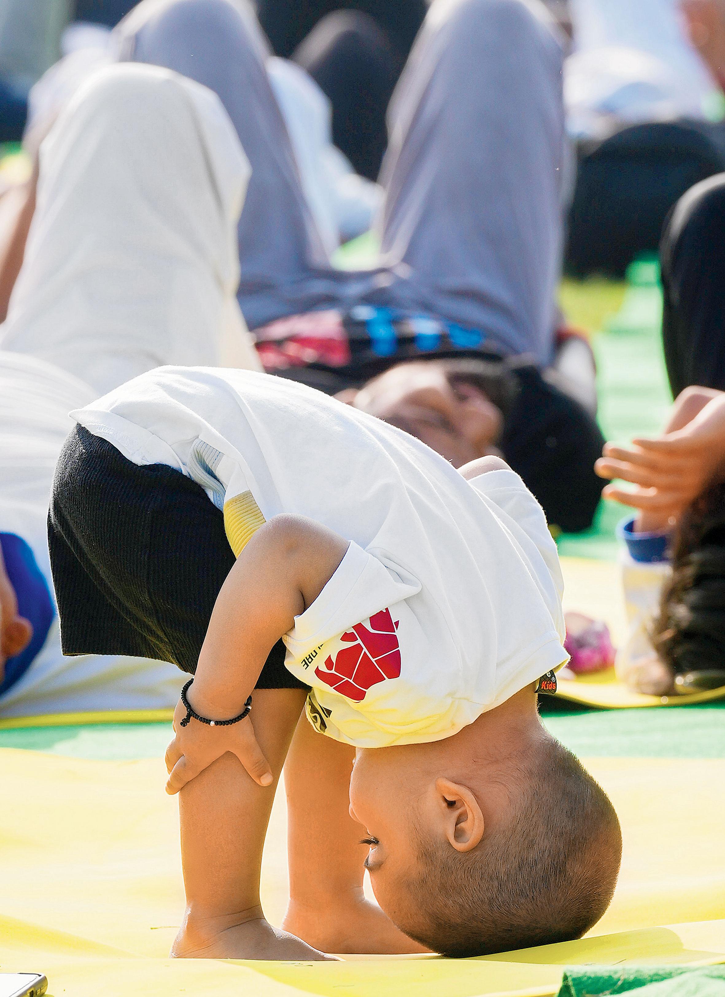 ગઈ કાલે દિલ્હીમાં કર્તવ્યપથ પર યોગ કરતું નાનું બાળક.
