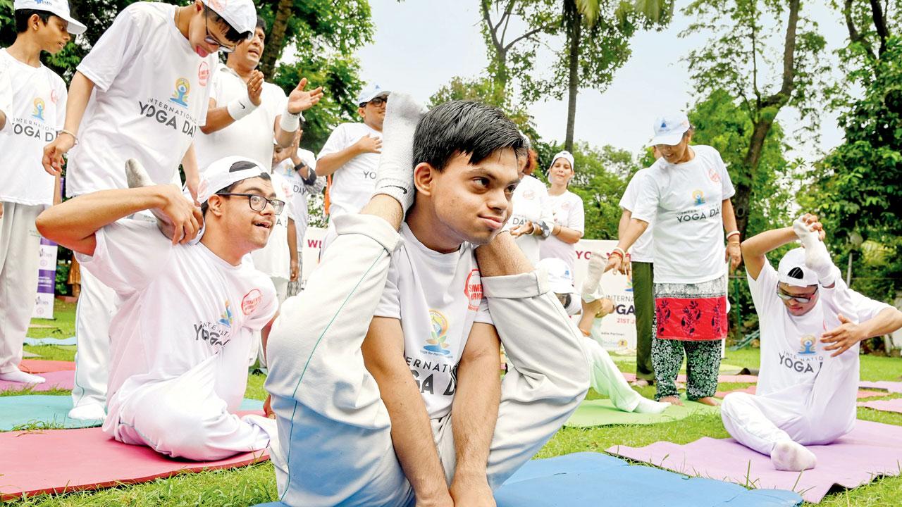 કલકત્તામાં યોગ કરતાં મનોવિકાસ કેન્દ્રનાં દિવ્યાંગ બાળકો.