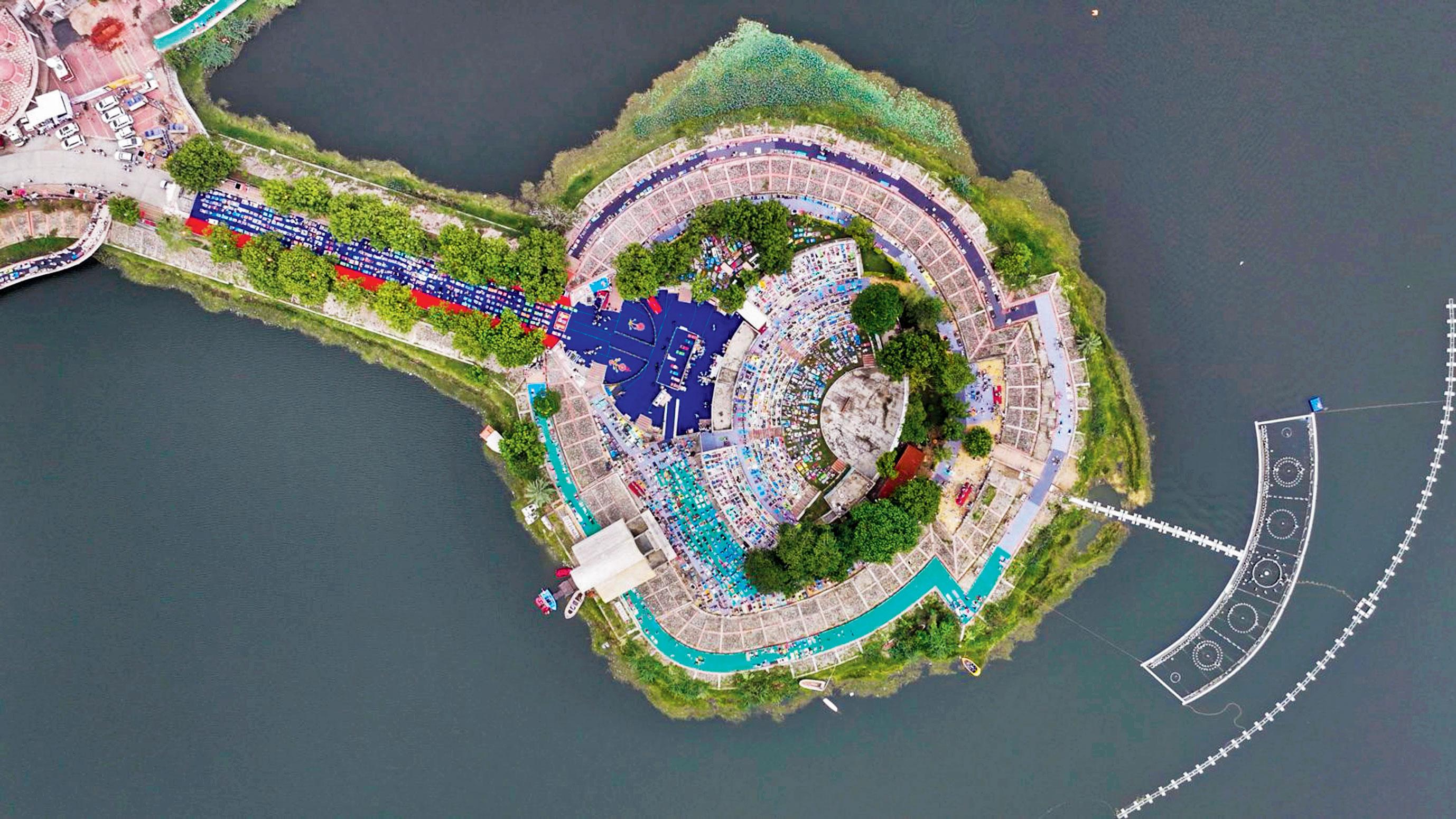 વડનગરના શર્મિષ્ઠા તળાવના પરિસરમાં થયેલા યોગ કાર્યક્રમની ડ્રોન તસવીર.