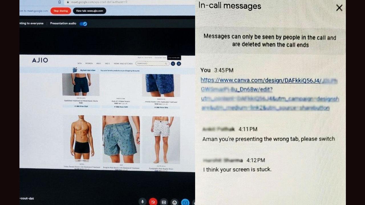 ઑનલાઇન મીટિંગમાં ફની સિચુએશન્સ ક્રીએટ થતી રહે છે. એક યુઝરે ગૂગલ મીટ પર તેની ઑફિસની મીટિંગ દરમ્યાનની ફની સિચુએશન વિશે સોશ્યલ મીડિયા પર જણાવ્યું હતું. જે જાણીને સોશ્યલ મીડિયા યુઝર્સને આશ્ચર્ય થઈ રહ્યું છે. અમન નામના આ યુઝરે આ ઑનલાઇન મીટિંગમાં તેને માટે શરમજનક ક્ષણ વિશે ટ્વિટર પર જણાવ્યું હતું. આ પોસ્ટમાં સ્ક્રીનશૉટથી ખ્યાલ આવે છે કે ગૂગલ મીટના સેશન દરમ્યાન તેનાથી ભૂલથી એક ઑનલાઇન શૉપિંગ વેબસાઇટમાંથી બૉક્સર્સની સ્ક્રીન શૅર થઈ ગઈ હતી. તેના કલીગ્સે તેને જણાવ્યું કે તેં ખોટી સ્ક્રીન રજૂ કરી છે. આ પોસ્ટની કૅપ્શનમાં તેણે લખ્યું હતું, ‘ગાય્ઝ, પ્લીઝ મારા માટે પ્રાર્થના કરજો.’ આ પોસ્ટને ૧.૬ લાખથી વધારે વ્યુઝ મળ્યા છે.