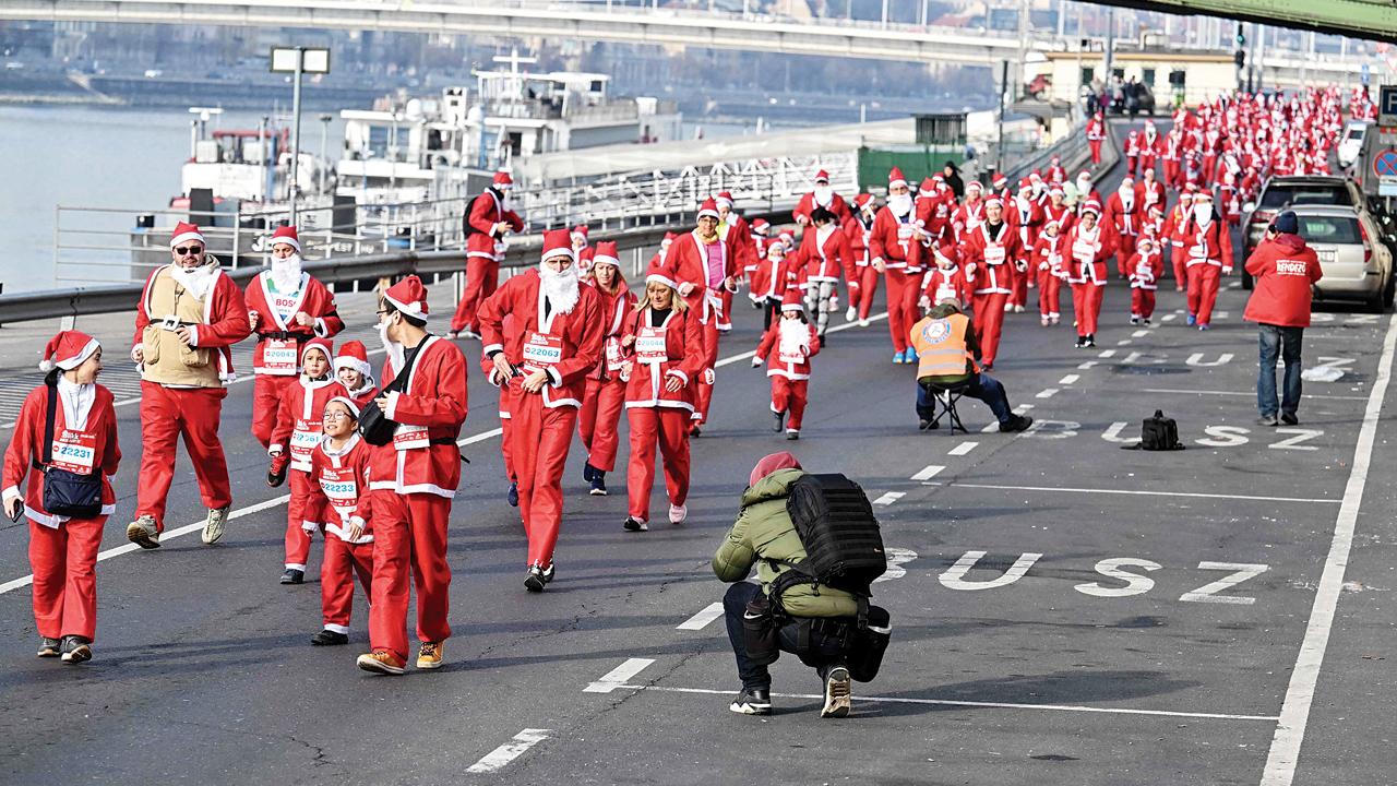 હંગેરીની રાજધાની બુડાપેસ્ટમાં ગઈ કાલે ટ્રેડિશનલ ક્રિસમસ સૅન્ટા ક્લૉઝ ચૅરિટી રનમાં મોટી સંખ્યામાં લોકોએ સૅન્ટા ક્લૉઝના કૉસ્ચ્યુમ પહેરીને ભાગ લીધો હતો.