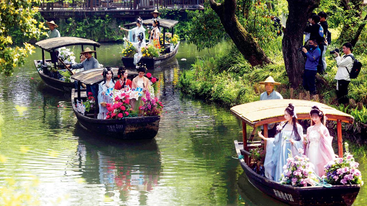 ચીનના પૂર્વીય ઝેજિયાંગ પ્રાંતમાં હેંગઝુમાં રવિવારે એક ટૂરિઝમ ઇવેન્ટ દરમ્યાન પુષ્પદેવીઓ તરીકેના હેનફુ પરંપરાગત ડ્રેસમાં યુવતીઓ. તસવીર એ.એફ.પી.
