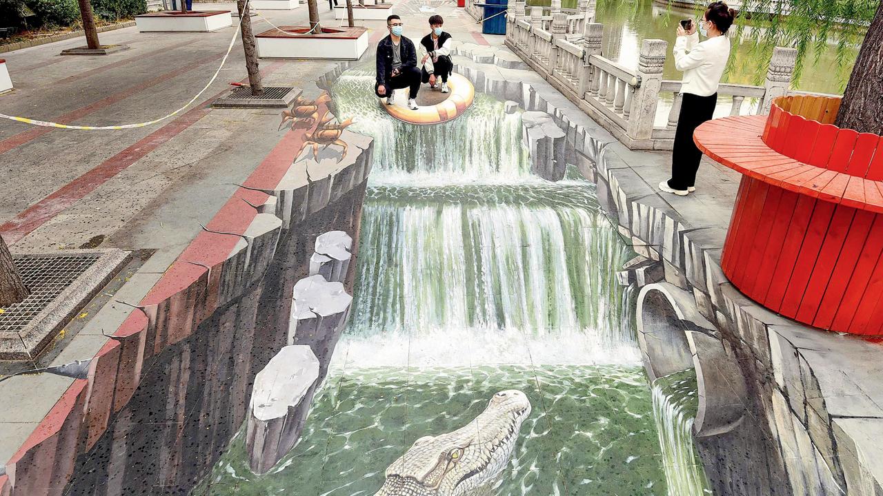 ચીનના ઉત્તરમાં આવેલા હેબેઈ પ્રૉવિન્સમાં હૅન્દનમાં રસ્તા પર તૈયાર કરવામાં આવેલા થ્રી-ડી સ્ટ્રીટ પેઇન્ટિંગને માણી રહેલા અને આ પેઇન્ટિંગની સાથે ફોટોગ્રાફ ક્લિક કરાવી રહેલા લોકો. તસવીર એ.એફ.પી.