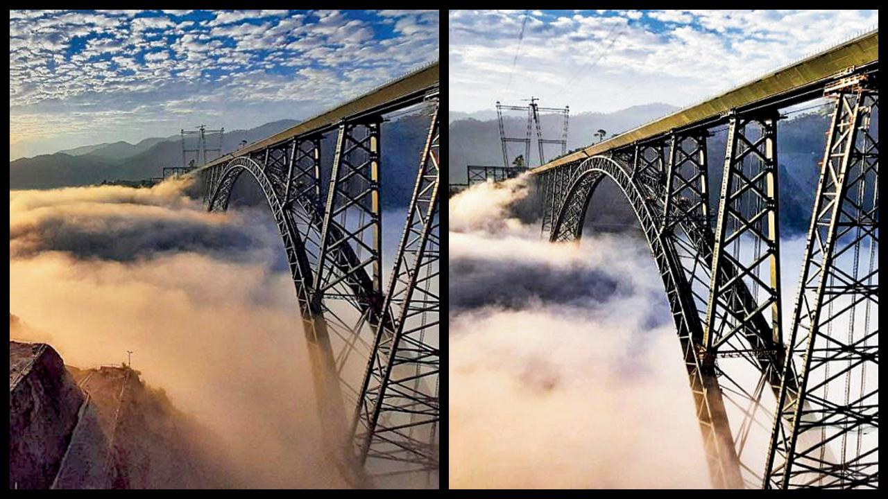 ભારતીય રેલવેએ ઉધમપુર-શ્રીનગર-બારામુલ્લા રેલ લિન્ક પ્રોજેક્ટ અંતર્ગત બનાવવામાં આવેલા ચેનાબ નદી પરના પુલના ફોટો શૅર કર્યા હતા. ૧૪ ઑગસ્ટે પુલનું નિર્માણકાર્ય પૂર્ણ થયું હતું. કુલ ૨૭૨ કિલોમીટરના પ્રોજેક્ટ પૈકી ૧૬૧ કિલોમીટર પરનું કામ તબક્કાવાર શરૂ કરવામાં આવ્યું હતું. પહેલા તબક્કાનું કામ ૨૦૦૯માં શરૂ કરવામાં આવ્યું હતું. ત્યાર બાદ જૂન ૨૦૧૩માં બનીહાલ-કાઝીગુંડ અને જુલાઈ ૨૦૧૪માં ઉધમપુર-કટરા માર્ગ શરૂ થયો હતો. ભારતીય રેલવે દ્વારા શૅર કરવામાં આવેલા ફોટોમાં વાદળોના સમુદ્ર પર નિર્માણાધીન ચેનાબ પુલની કમાન દેખાય છે. લોકોએ નિમાર્ણકાર્ય પૂર્ણ થતાં રેલવેને અભિનંદન આપ્યાં હતાં. ૧૩૧૫ મીટરનો ચેનાબ પુલ એન્જિનિયરિંગ અજાયબી છે. આ પુલ નદીના તટની સપાટીથી ૩૫૯ મીટર ઉપર વિશ્વનો સૌથી ઊંચો રેલવે-બ્રિજ છે. તે આઇફલ ટાવર કરતાં ૩૫ મીટર ઊંચો છે.