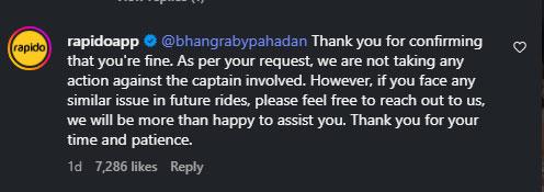 વીડિયો વાયરલ થયા પછી, રેપિડોએ કમેન્ટ કરીને જવાબ આપ્યો, `અમને ખુશી છે કે તમે ઠીક છો. તમારી સાથે સંમત છીએ, અમે ડ્રાઇવર સામે કાર્યવાહી કરી રહ્યા નથી. જો તમને ભવિષ્યમાં કોઈ સમસ્યાનો સામનો કરવો પડે, તો કૃપા કરીને અમને જણાવો, અમે તમને મદદ કરીશું.`