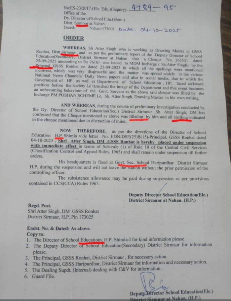 શિક્ષણ વિભાગ દ્વારા લખાયેલા આદેશમાં પણ અસંખ્ય ભૂલો છે. આઘાતજનક વાત એ છે કે, શિક્ષણ વિભાગ દ્વારા ડ્રોઈંગ શિક્ષકને જોડણીની ભૂલો માટે જાહેર કરાયેલા આદેશમાં પણ જોડણીની ભૂલો છે. આ આદેશમાં અસંખ્ય જોડણીની ભૂલો છે (જેમ કે સિરમોર, એજ્યુકેશન અને પ્રિન્સિપાલ જેવા શબ્દોમાં). આ અંગે, શિક્ષણ વિભાગના ડિરેક્ટર રાજીવ ઠાકુરે જણાવ્યું હતું કે શિક્ષકને જાહેર કરાયેલા સસ્પેન્શન આદેશમાં ક્લર્કની ભૂલ હતી જે સુધારી શકાય તેવી હતી, પરંતુ ચૅક પરની ભૂલ સુધારી શકાતી નહોતી. તેમણે ફક્ત શબ્દોની જોડણી બદલી નાખી.