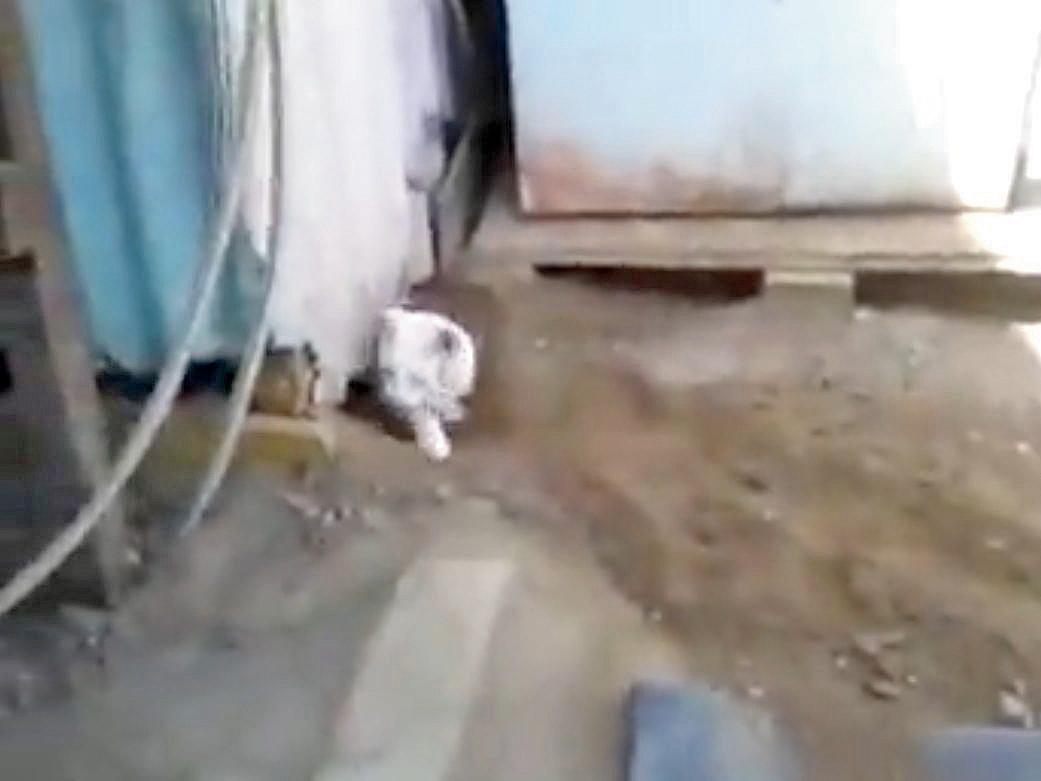 પતરાના શેડની પાછળ ફસાયેલી બિલાડી થોડી-થાડી વારે સસલાને પગથી જાણે ઇશારો કરીને વધુ ખોદવા કહેતી હોય એમ સસલાને બિલાડીનો પગ અડતાં જ તે ફરીથી ખોદવા માંડે છે.
