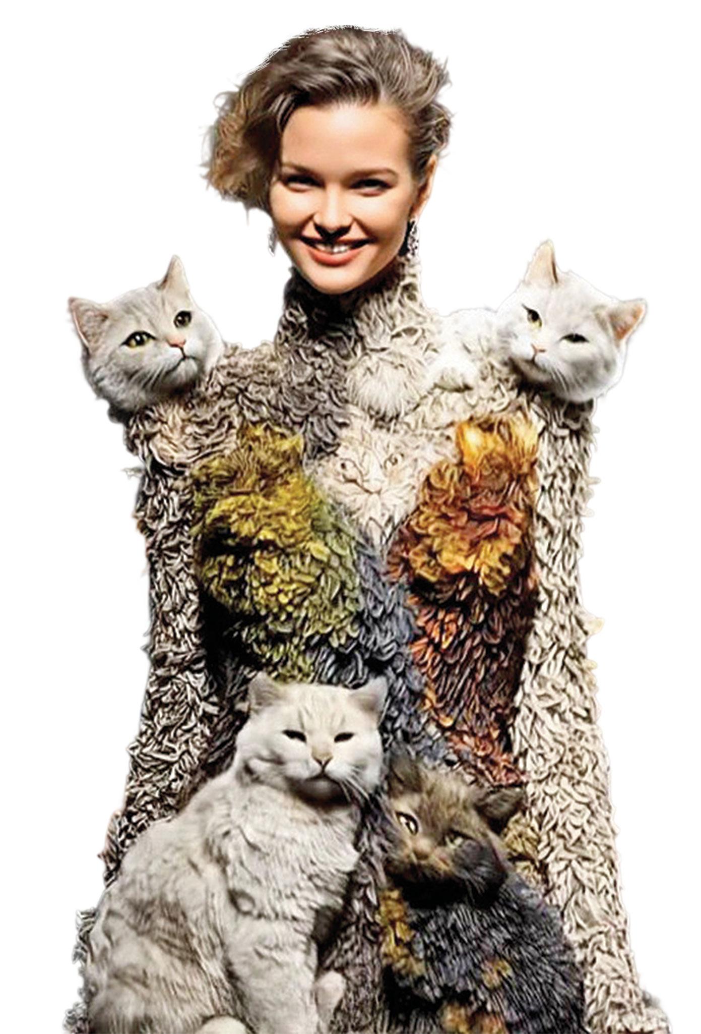 મહિલા મૉડલોએ જાણે જીવતીજાગતી બિલાડીઓ કપડાંમાં ભરાવી હોય એવો ભાસ થાય છે. બિલાડીના ફર જેવું જ ફૅબ્રિક ધરાવતી બિલાડીઓ જાણે અસલી હોય એવો ભાસ આર્ટિફિશ્યલ ઇન્ટેલિજન્સ (AI) દ્વારા આપવામાં આવ્યો હતો